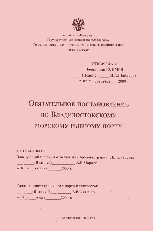 Обязательное постановление по Владивостокскому морскому рыбному порту издано на основе Кодекса торгового мореплавания, главы: 5,6,7 и является дополнением к "Общим правилам плаваниям и стоянкам в морских портах СССР и на подходах к ним" утвержденные ММФ и МРХ 20 февраля 1990 г. и "Правилами плавания в порту Владивосток".