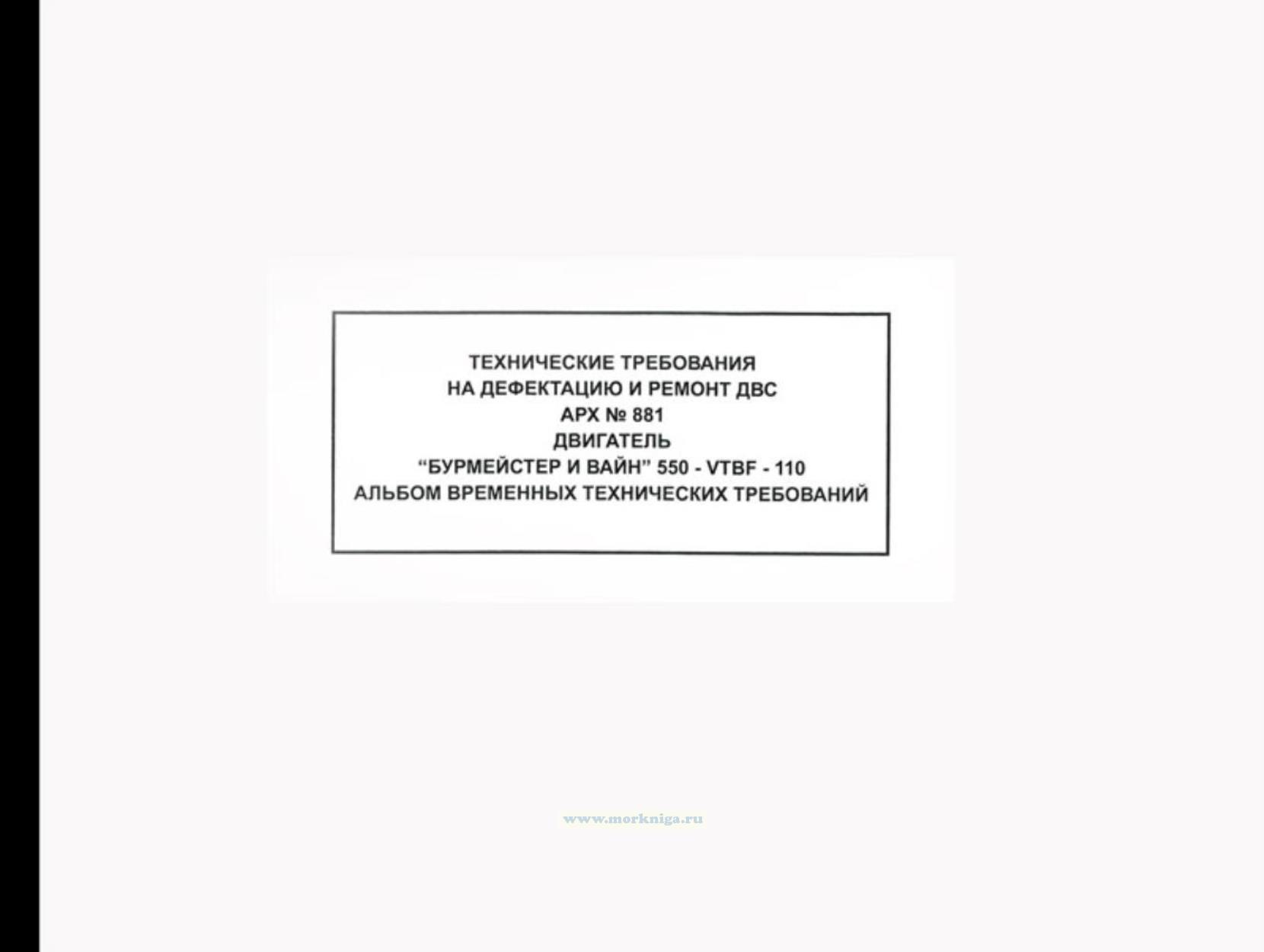 Временные технические условия на дефектацию и ремонт двигателей "Бурмейстер и Вайн" 550-VTBF -110 разработаны с учетом опыта ремонта этих двигателей на судоремонтных предприятиях, а также изготовления двигателей типа ДКРН 50/110 и монтажа их на строящихся судах.