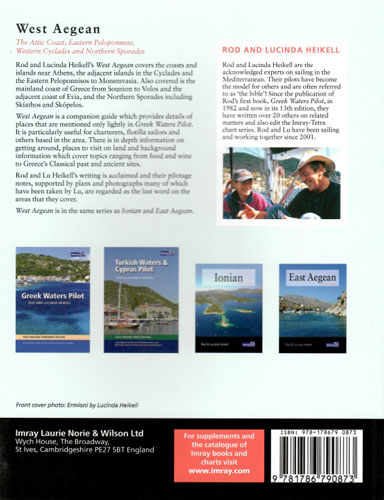 Rod Heikell's West Aegean covers the coasts and islands near Athens, the adjacent islands in the Cyclades and the Eastern Peloponnisos to Monemvasia. Also covered is the mainland coast of Greece from Sounion to Volos and the adjacent coast of Evia, and the Northern Sporades including Skiathos and Skopelos.