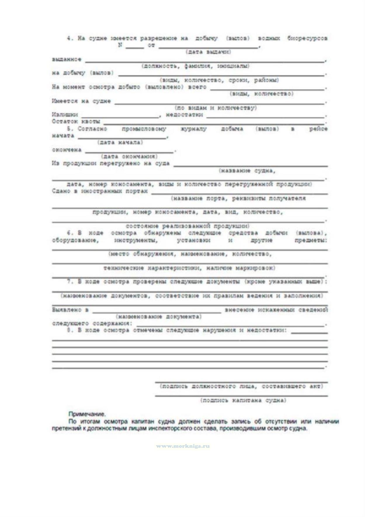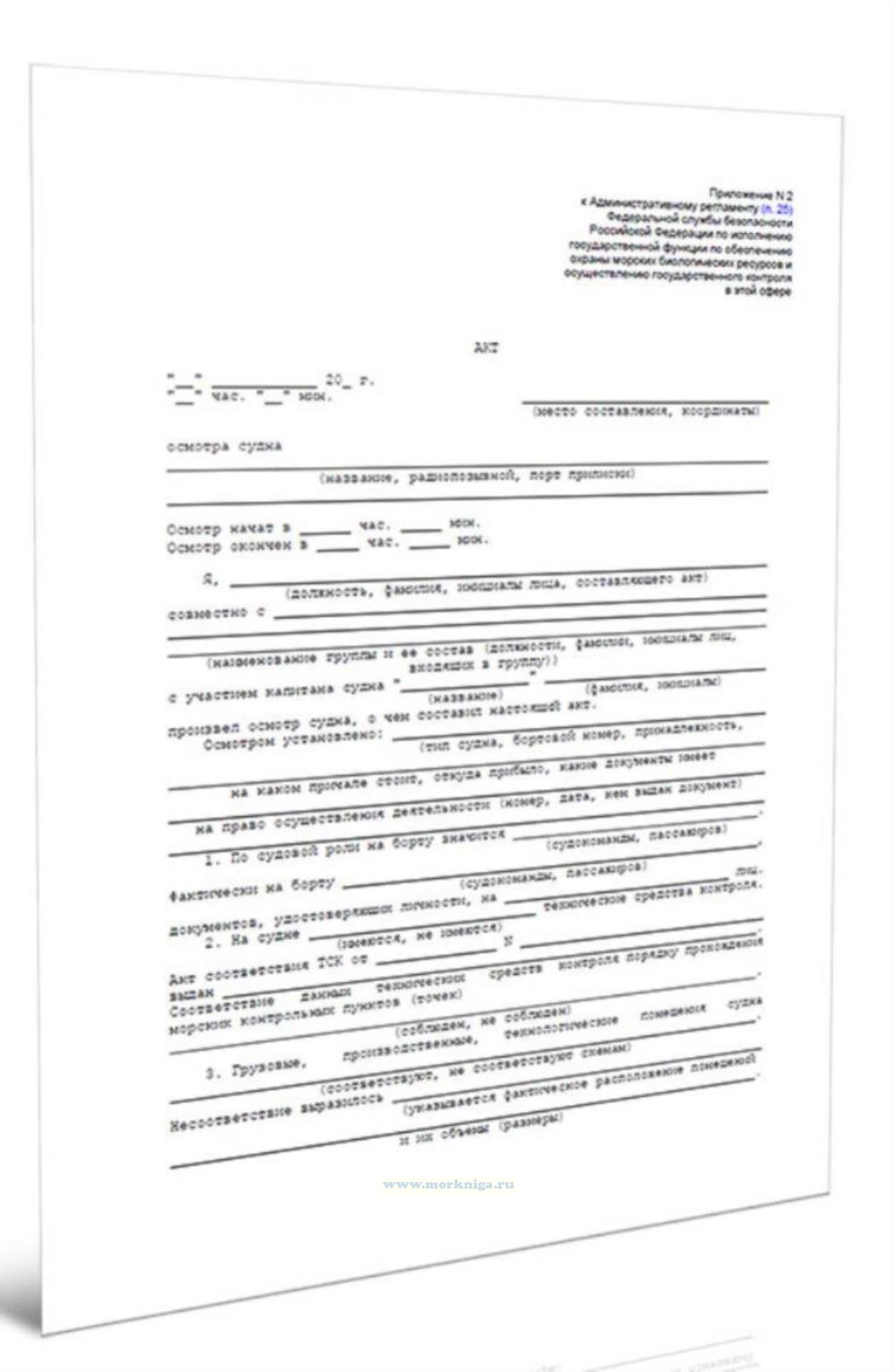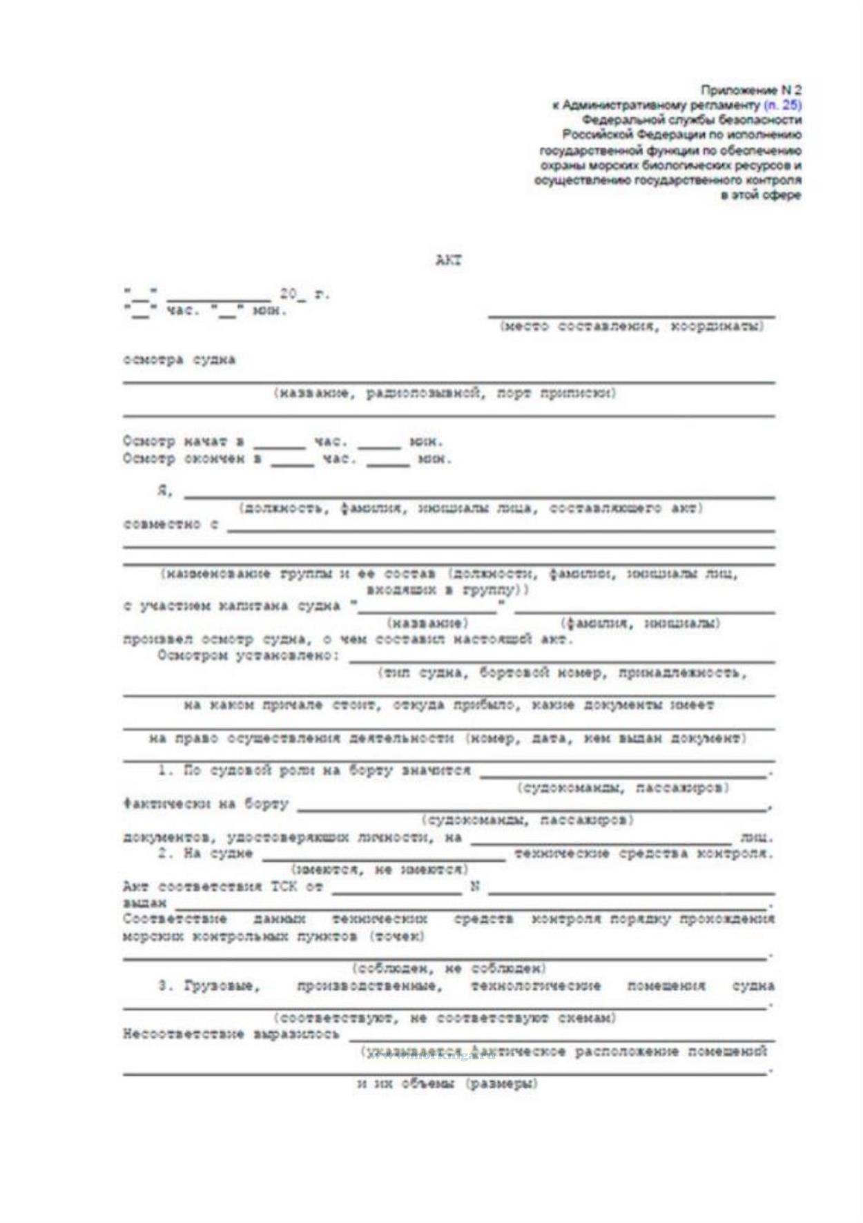 Форма акта осмотра судна соответствует Приложению N 2 к Приказу ФСБ РФ от 11.01.2009 N 1 "Об утверждении Административного регламента Федеральной службы безопасности Российской Федерации по исполнению государственной функции по обеспечению охраны морских биологических ресурсов и осуществлению государственного контроля в этой сфере", который утратил силу.