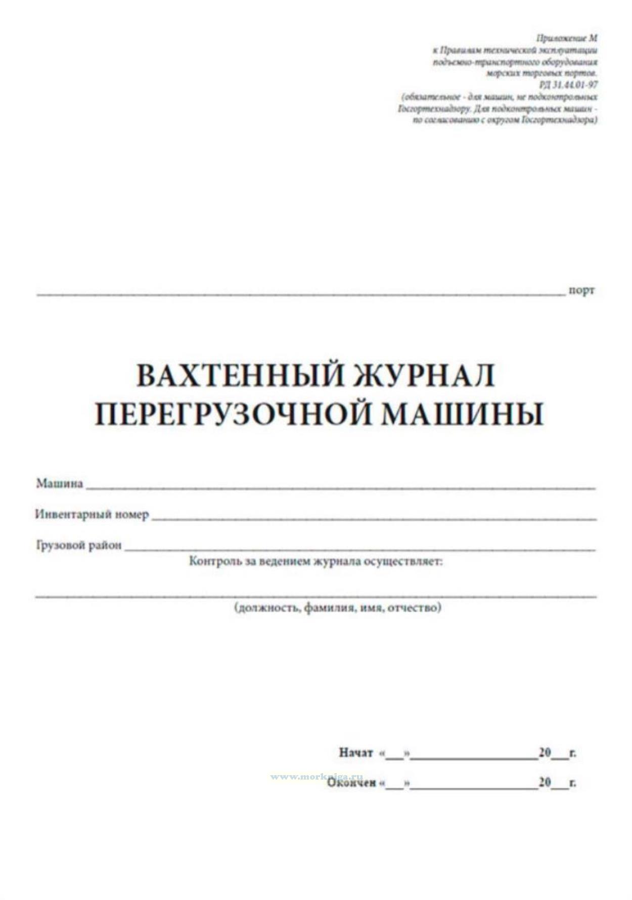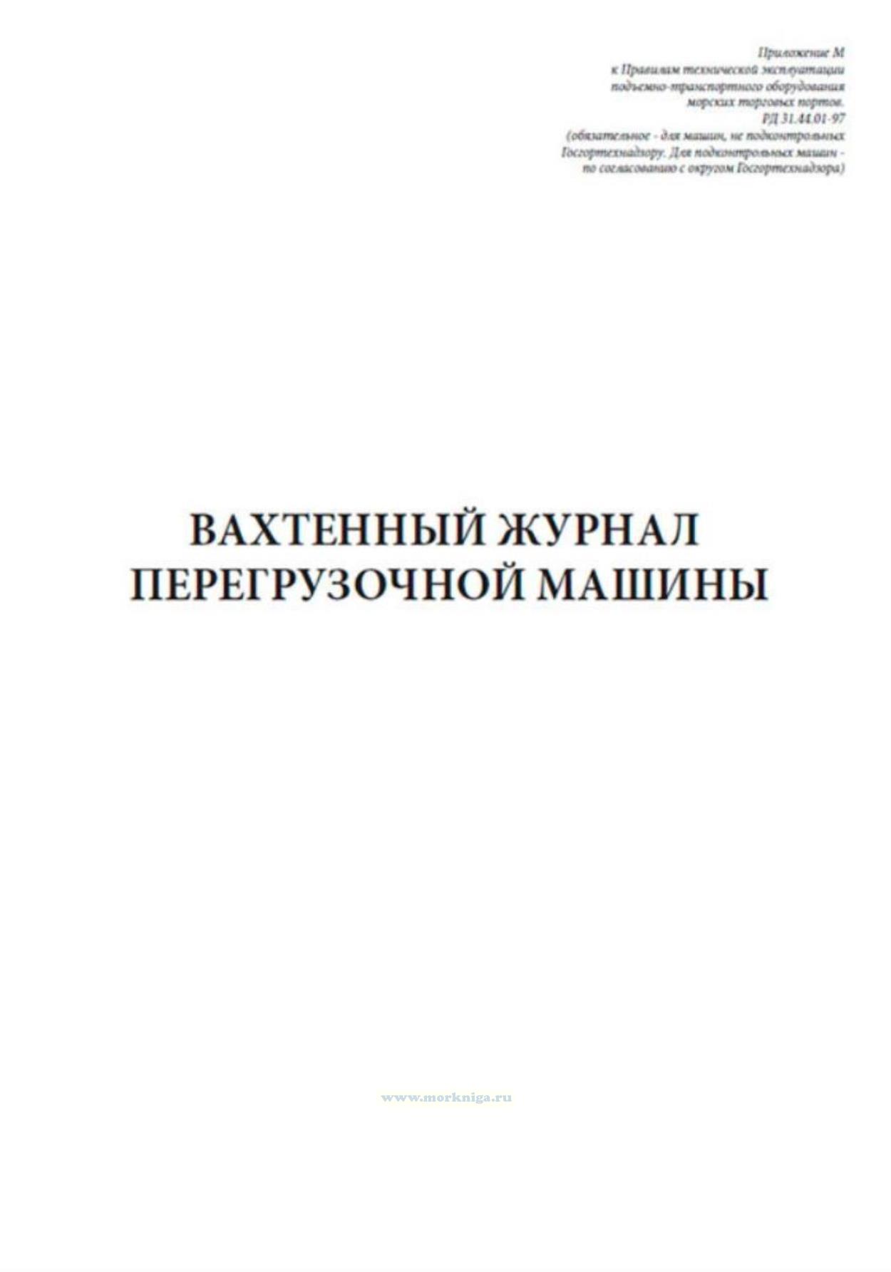 Форма вахтенного журнала перегрузочной машины соответствует Приложению 14 к Правилам технической эксплуатации подъемно-транспортного оборудования морских торговых портов.