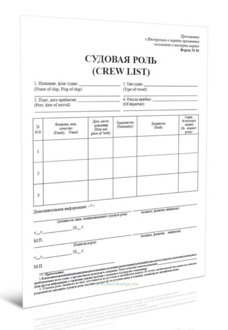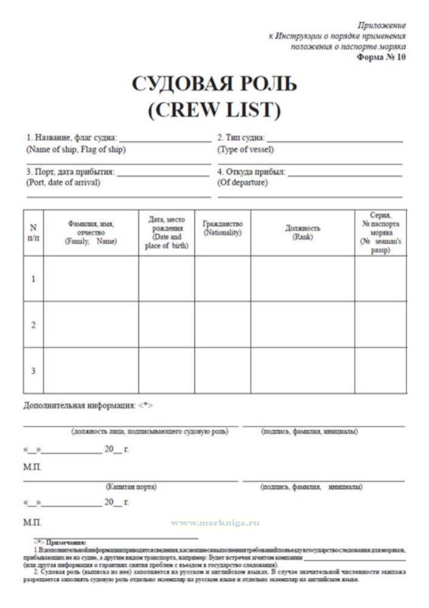 Бланк формы N 10 Судовая роль соответствует Приложению 2 к Приказу Минтранса РФ N 81, Минсельхозпрода РФ N 328 от 30.06.1998, который утратил силу.