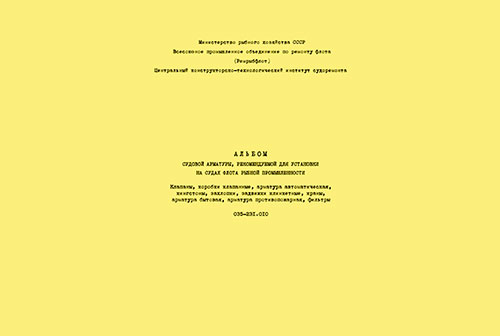 Альбом судовой арматуры, рекомендуемой для установки на судах флота рыбной промышленности, составлен Центральным конструкторско-технологическим институтом судоремонта.