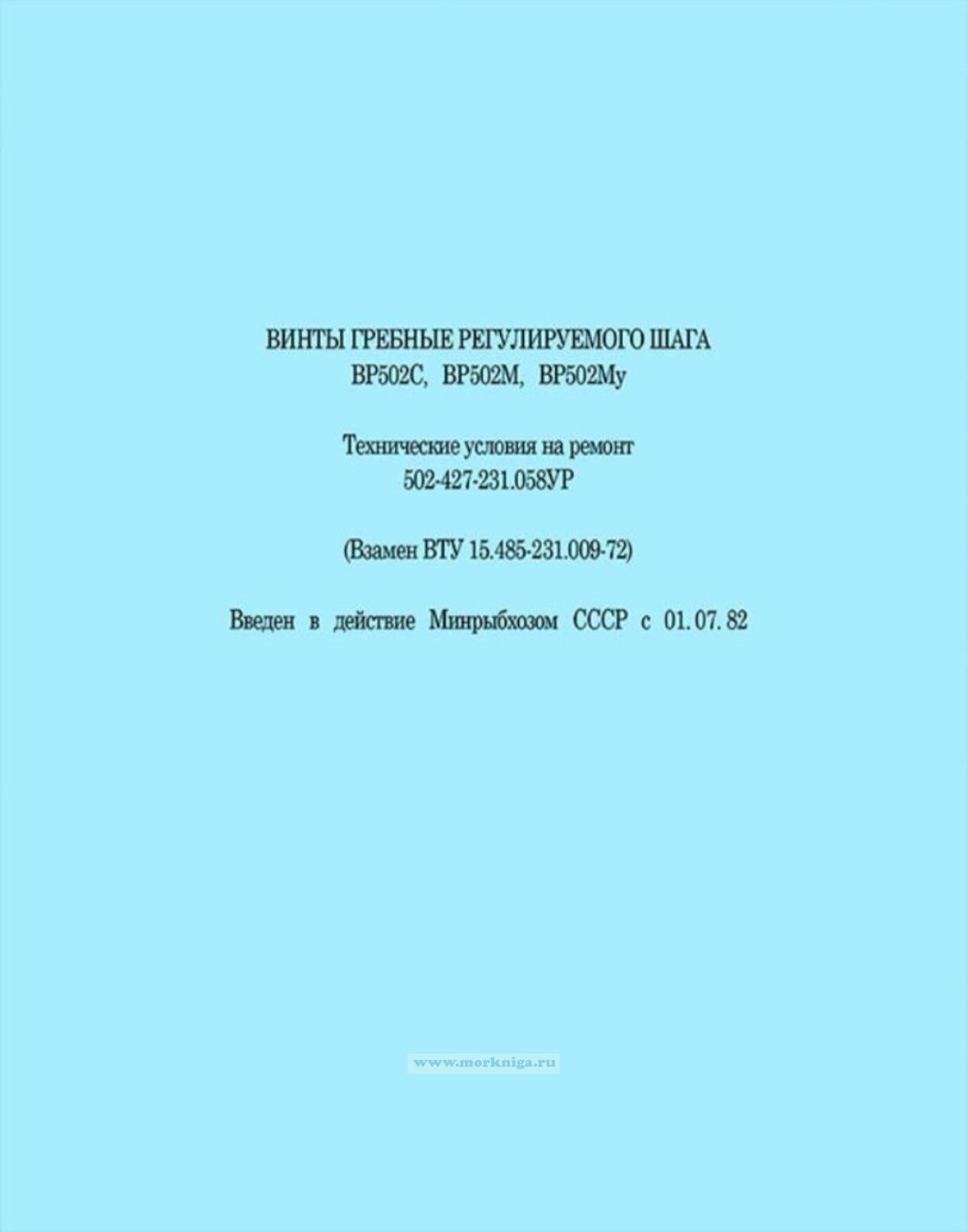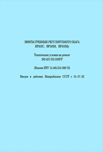 Винты гребные регулируемого шага. ВР502С, ВР502М, ВР502Му. Технические условия на ремонт. 502-427-231.058УР (Взамен ВТУ 15.485-231.009-72). Введен в действие Минрыбхозом СССР с 01.07.82