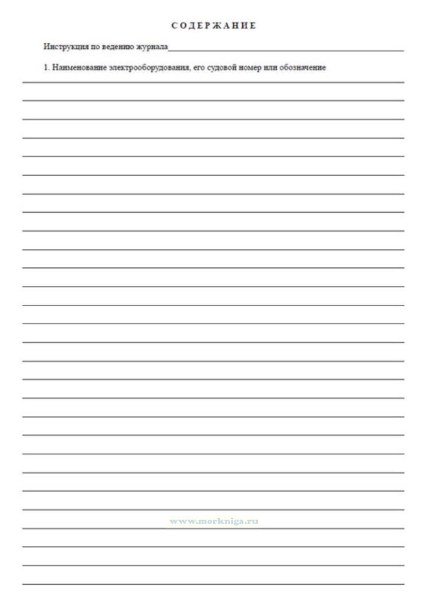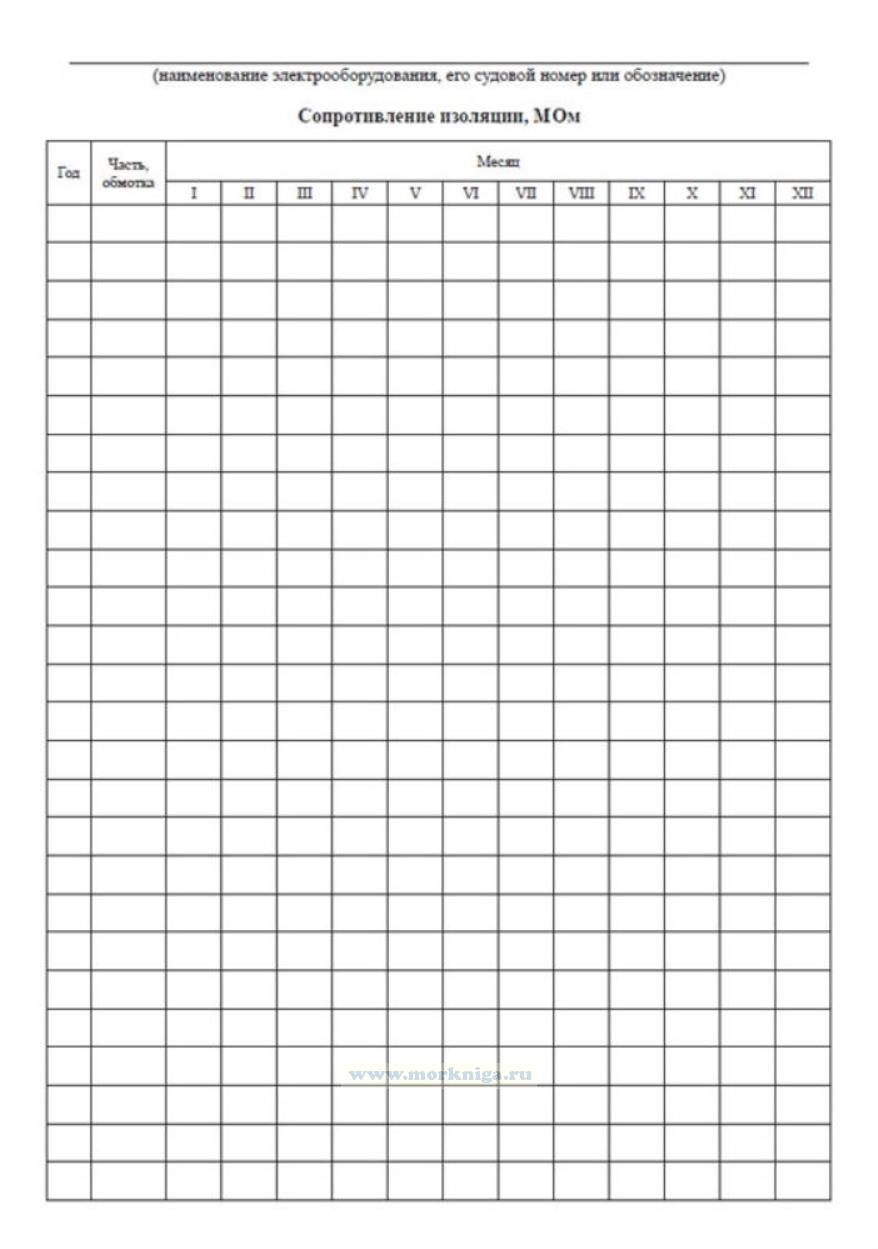 3.2. Внесению в журнал подлежат источники и преобразователи электроэнергии, распределительные устройства, электроприводы, бытовое и переносное электрооборудование и другие потребители электроэнергии, а также электрические средства автоматизации измерение сопротивления изоляции которых в отключенном состоянии выполняется ежемесячно в соответствии с Правилами технической эксплуатации судового электрооборудования. Для каждого СТС в журнале должна быть отведена одна или несколько страниц в зависимости от сложности СТС и наличия в нем электрических изолированных обмоток или частей (многоскоростные электродвигатели, трансформаторы, пускорегулирующая аппаратура и т. п.).