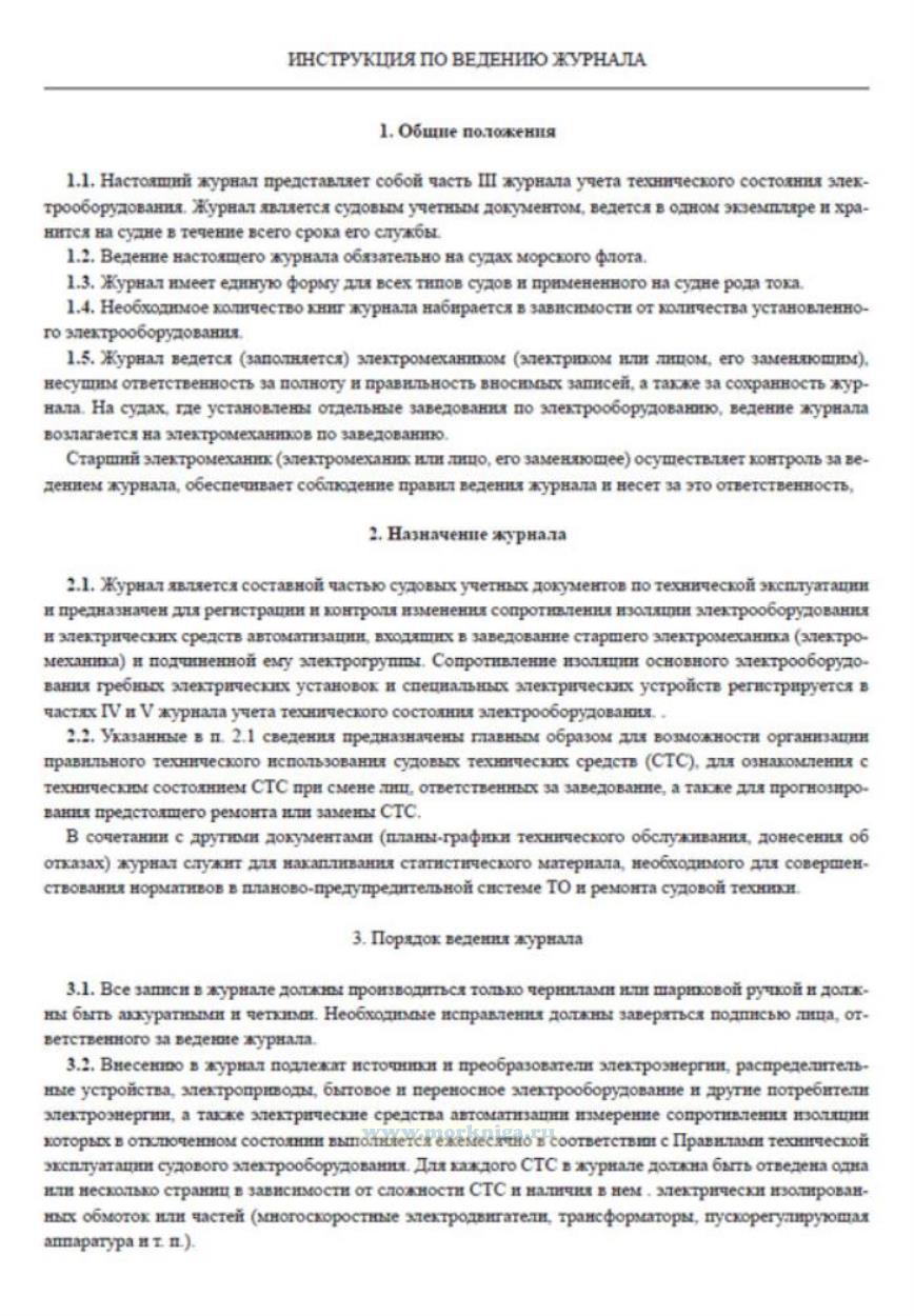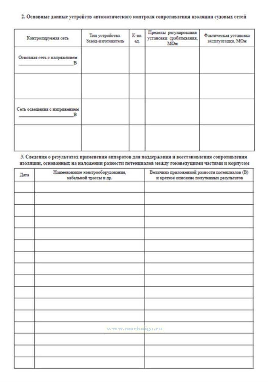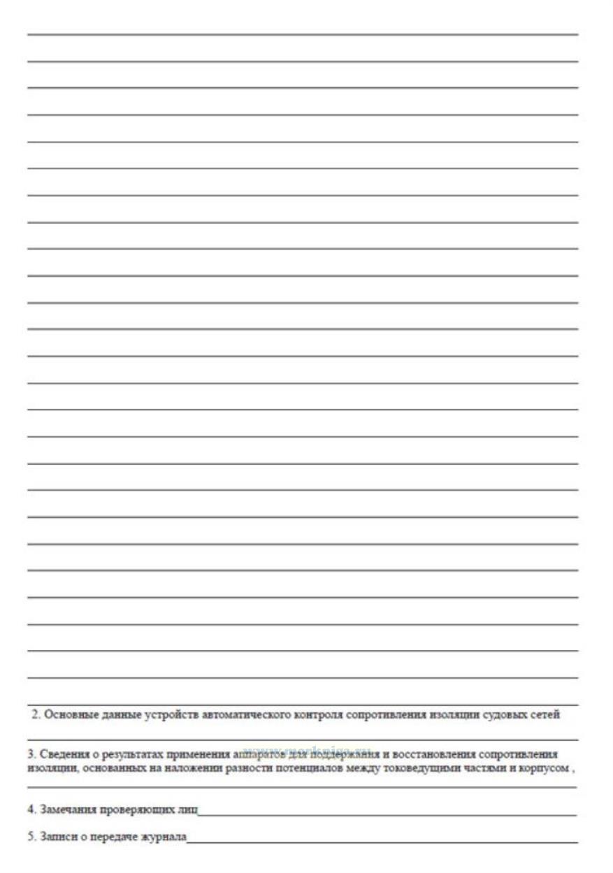 2.1. Журнал является составной частью судовых учетных документов по технической эксплуатациии предназначен для регистрации и контроля изменения сопротивления изоляции электрооборудования и электрических средств автоматизации, входящих в заведование старшего электромеханика (электромеханика) и подчиненной ему электрогруппы. Сопротивление изоляции основного электрооборудования гребных электрических установок и специальных электрических устройств регистрируется в частях IV и V журнала учета технического состояния электрооборудования.