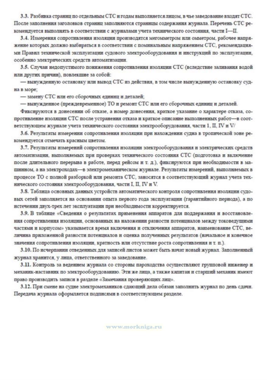 3.7. Результаты измерений сопротивления изоляции электрооборудования и электрических средств автоматизации, выполняемых при проверках технического состояния СТС (подготовка и включение после длительного перерыва в работе, перед рейсом и т. д.), фиксируются при необходимости в машинном, а на электроходах - в электромеханическом журнале.