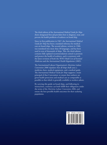 The International Medical Guide for Ships is an important resource for ensuring the health and safety of seafarers. It provides recommendations on medical care on board ships, including information on necessary medicines, medical equipment, and first aid procedures. The publication is updated to reflect the latest standards of the World Health Organization (WHO) and the International Labour Organization (ILO), which makes it possible to provide medical care comparable to that available on land. The guidance helps crews respond effectively to medical emergencies and supports the health of seafarers in conditions of isolation and long voyages.