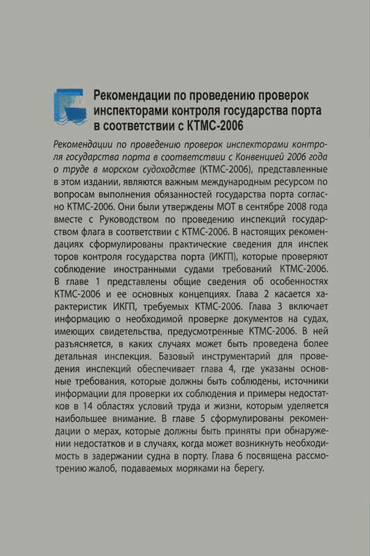 Рекомендации по проведению проверок инспекторами контроля государства порта в соответствии с Конвенцией 2006 года о труде в морском судоходстве (КТМС-2006), представленные в этом издании, являются важным международным ресурсом по вопросам выполнения обязанностей государства порта согласно КТМС-2006.