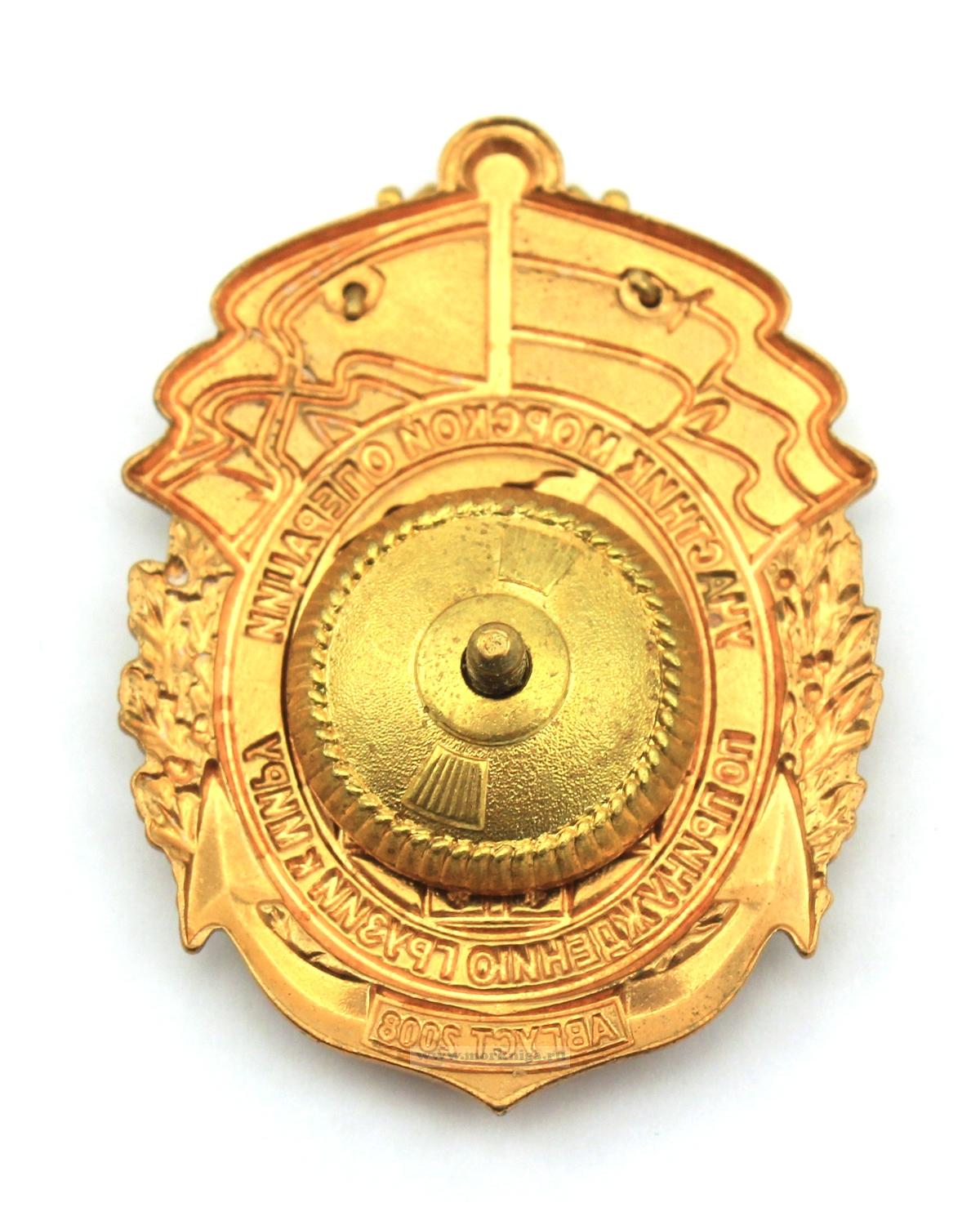 Награда выпущена в форме овального щита, помещенного на якорь и обрамленного лавровыми и дубовыми ветвями. Центральную часть занимает изображение ГРКР «Москва». Ниже выполнены три флага стран-участниц конфликта: Грузия, Абхазия, Южная Осетия. Кант щита синего цвета украшен золотистой надписью «УЧАСТНИК МОРСКОЙ ОПЕРАЦИИ ПО ПРИНУЖДЕНИЮ ГРУЗИИ К МИРУ». Нижнюю часть занимает небольшая планка красного цвета, где выбито «АВГУСТ 2008». Верхняя часть знака декорирована эмблемой ВМФ РФ, которая находится между флагами Российской Федерации и Андреевским.