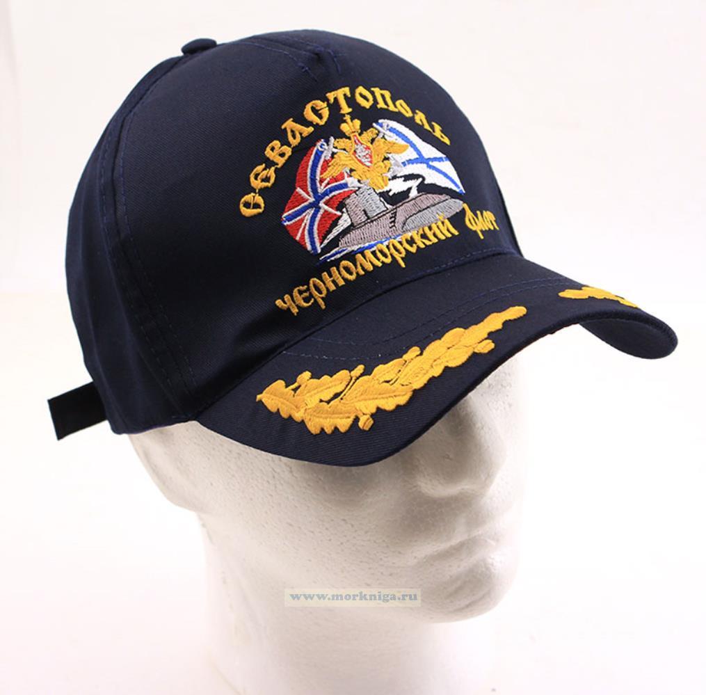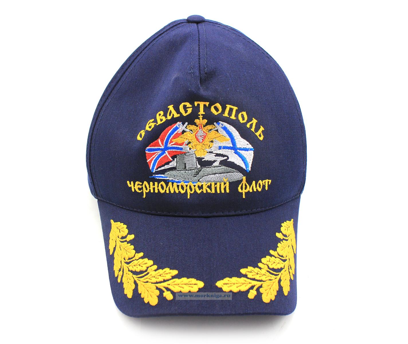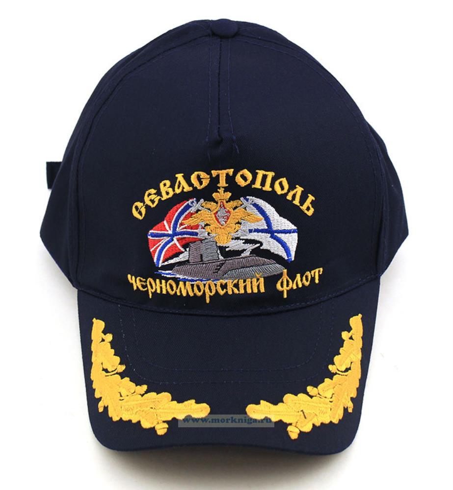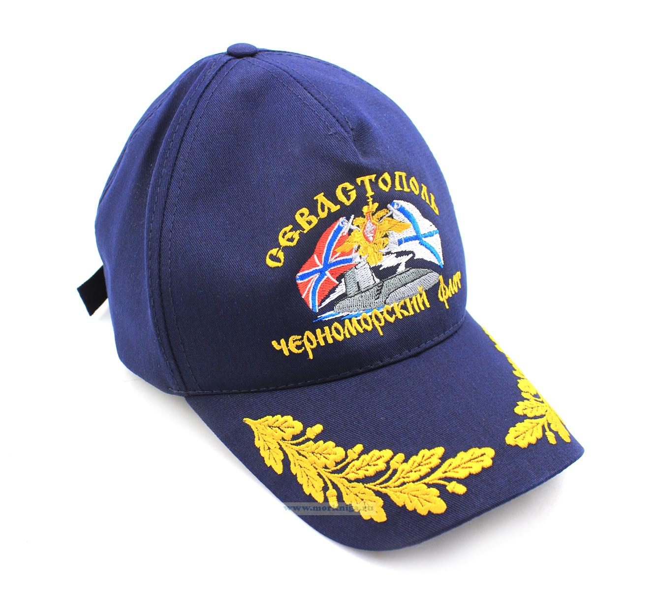 На бейсболке вышита надпись: Севастополь. Черноморский флот, на фоне герба России, АПЛ, Гюйс и Андреевский флаг.