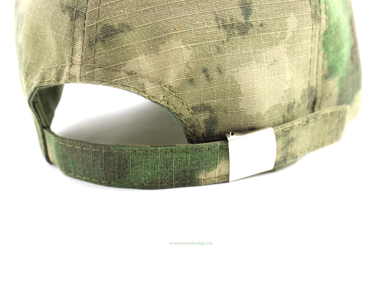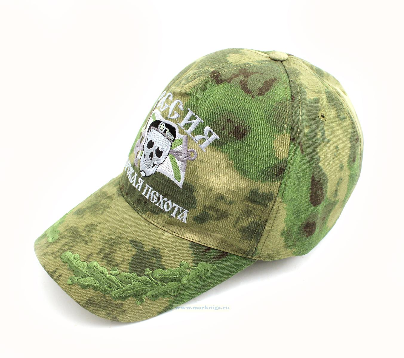 На бейсболке вышита надпись: Россия. Морская пехота, череп, Андреевский флаг