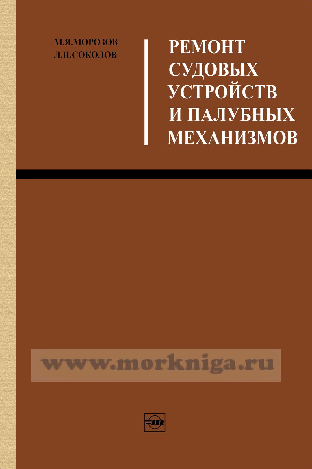В книге рассматриваются организация и технология ремонта судовых устройств (рулевого, якорного, швартовного, буксирного, грузового и шлюпоч ного) и палубных механизмов (рулевых машин, шпилей, брашпилей, лебедок кранов). Излагаются причины повреждений основных узлов и деталей и спосо бы устранения дефектов. Приводятся примеры из практики ремонта судовы устройств с описанием применяемых приспособлений. Часть книги посвящен технологии ремонта специальных палубных механизмов судов промыслового флота.