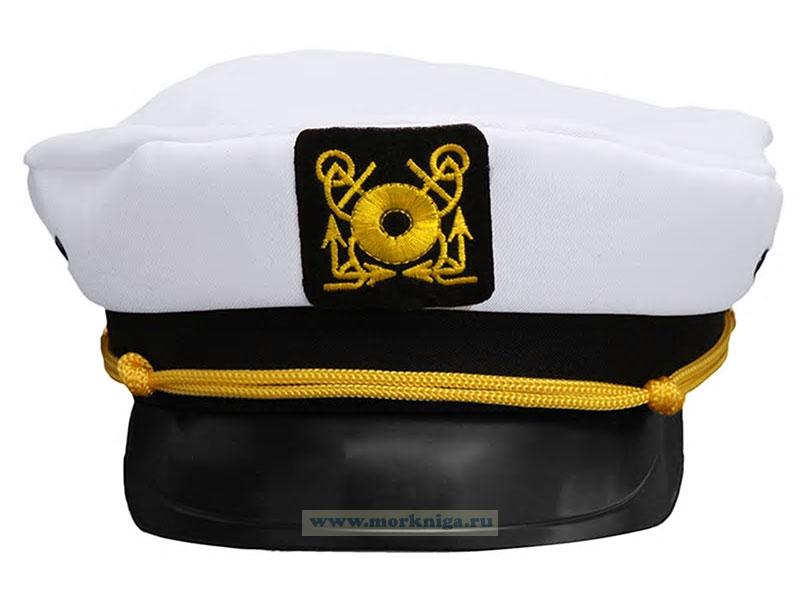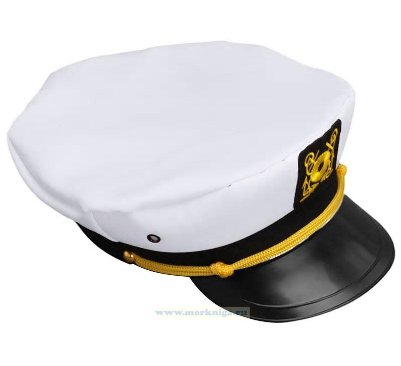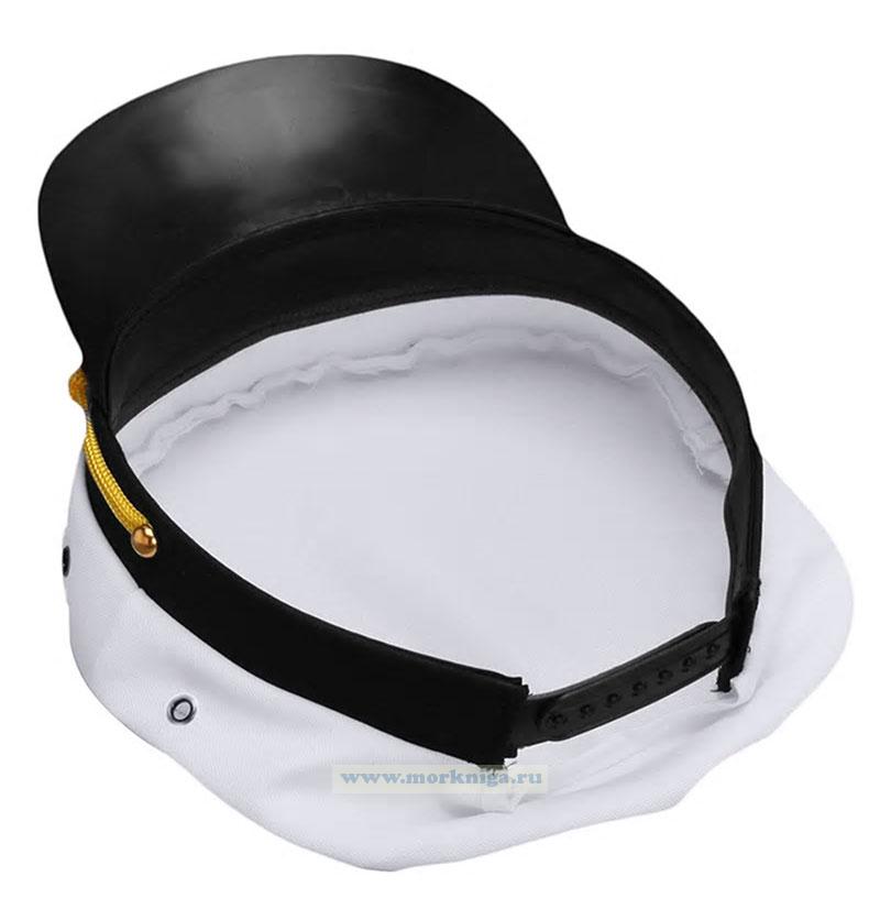Капитанка белого цвета, черный пластиковый козырек, желтый шнур.