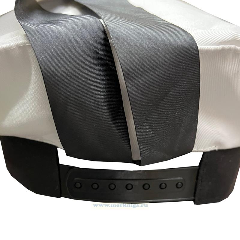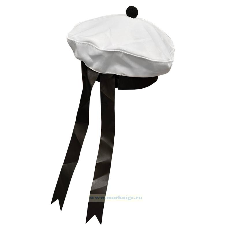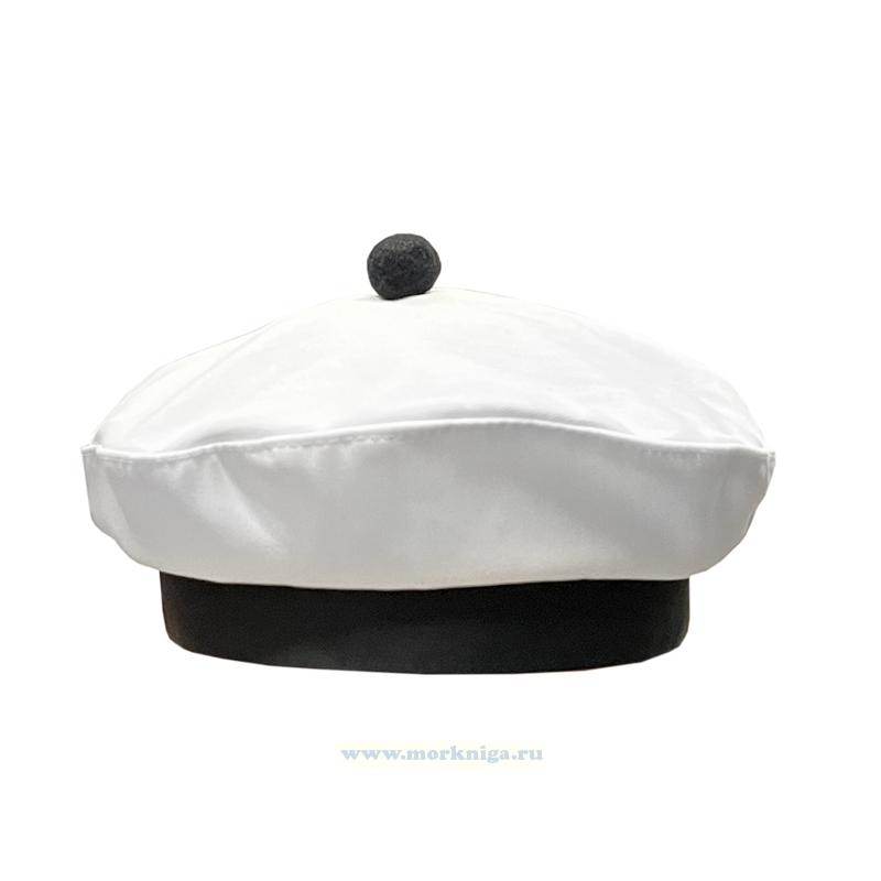 Бескозырка белого цвета с двумя черными лентами сзади и помпоном на макушке.