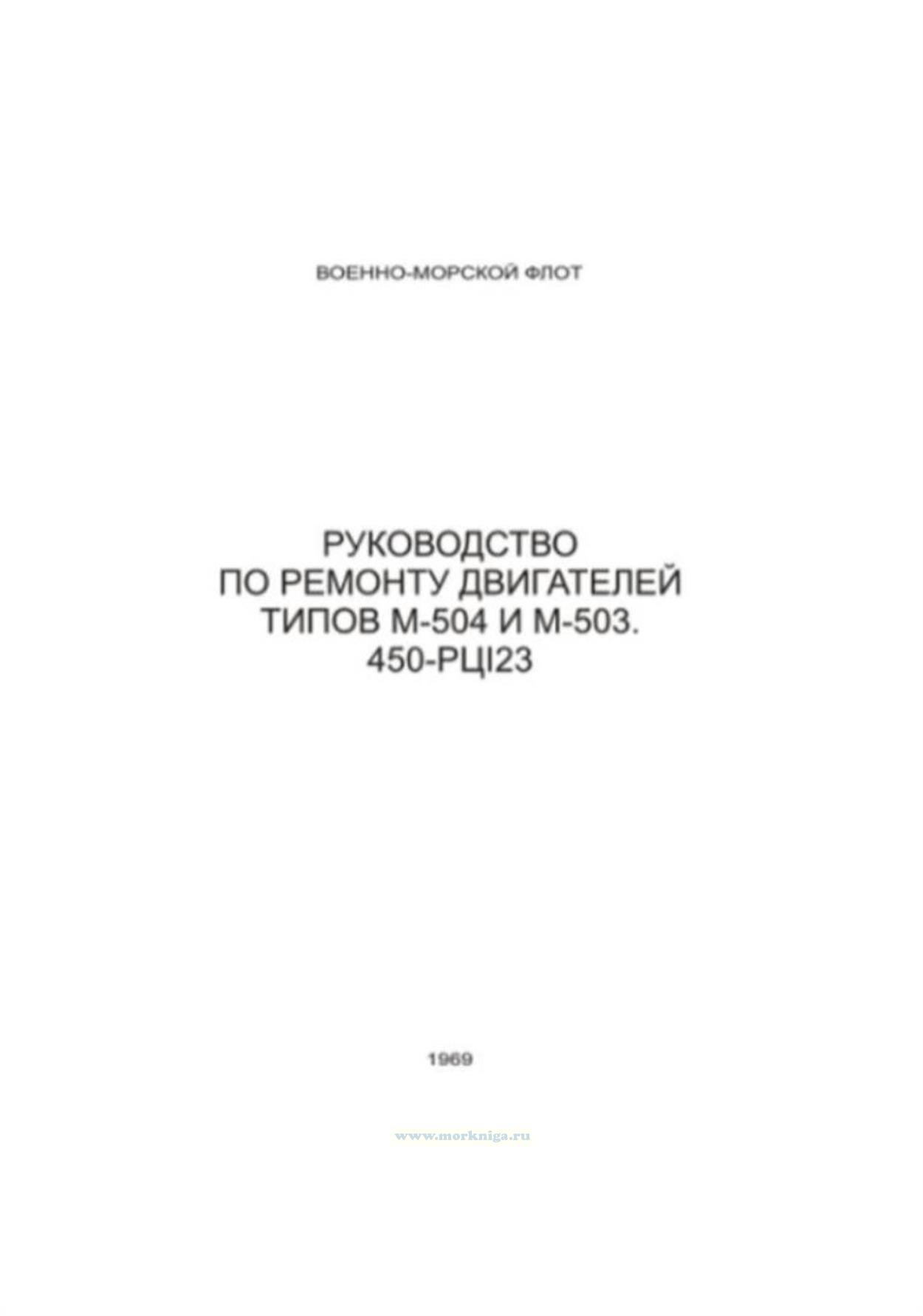 Настоящее Руководство по ремонту двигателей типов М-504 и М-503 представляет собой откорректированное объединенное издание Руководства по ремонту двигателей типа М-503, издания ВМФ 1962 г. и Руководства по ремонту двигателей типа М-504, издания 1964 года. При разработке объединенного Руководства за основу взята конструкторская документация головного завода-изготовителя двигателей по ее состоянию на 1 июля 1967 года.