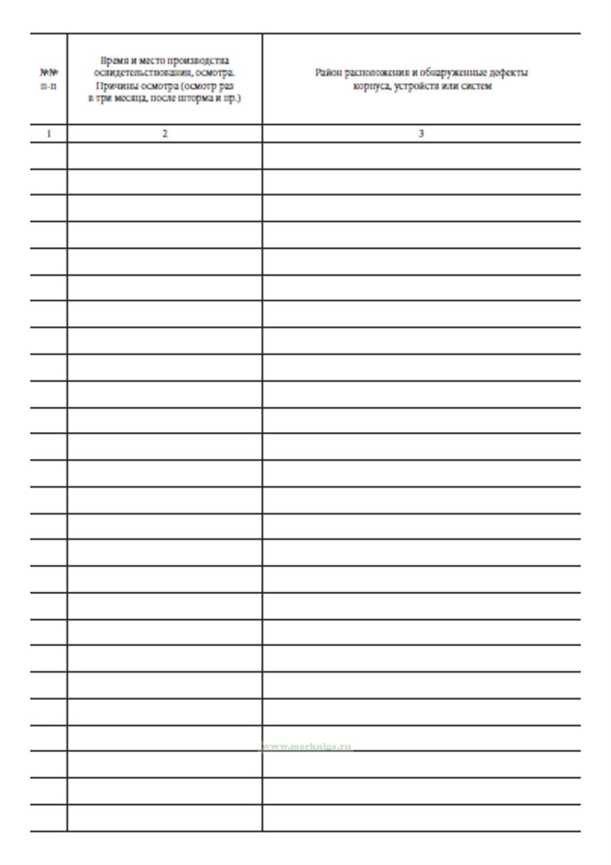 3. В графе 2 указывается дата и место геограический пункт) производства освидетельствования, а также отмечается вид освидетельствования - ежедневный, еженедельный, очередной, раз в три месяца, после аварии, большого морского