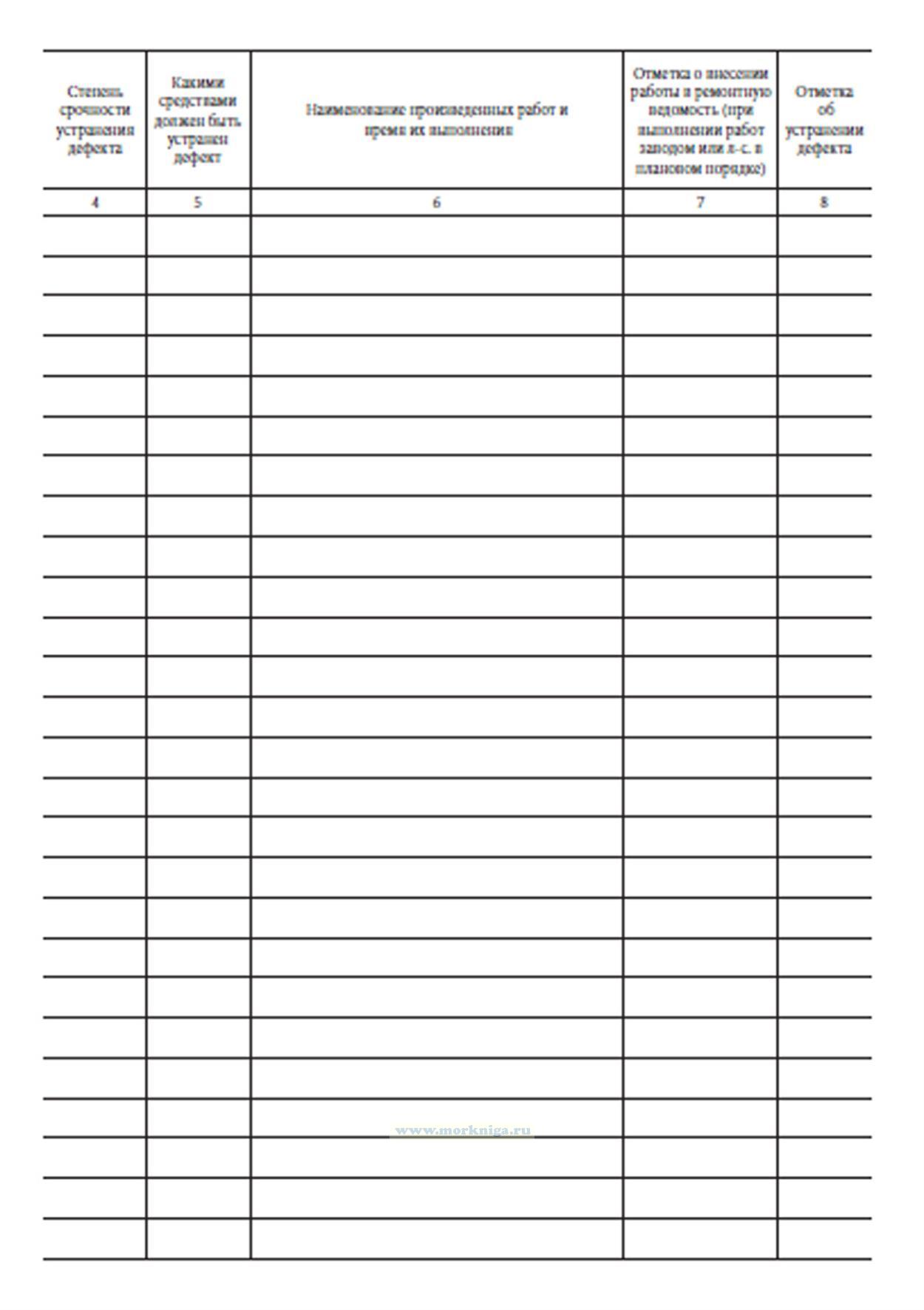 Если об обнаруженном дефекте в графе 4 записано, что он должен быть устранен при очередном планово-предупредительном ремонте заводскими или судовыми средствами, то в графе 7 делается краткая запись, когда работа эта внесена в ремонтную ведомость (например, «Работа внесена в ремонтную ведомость 7-IX 1999 г.»).