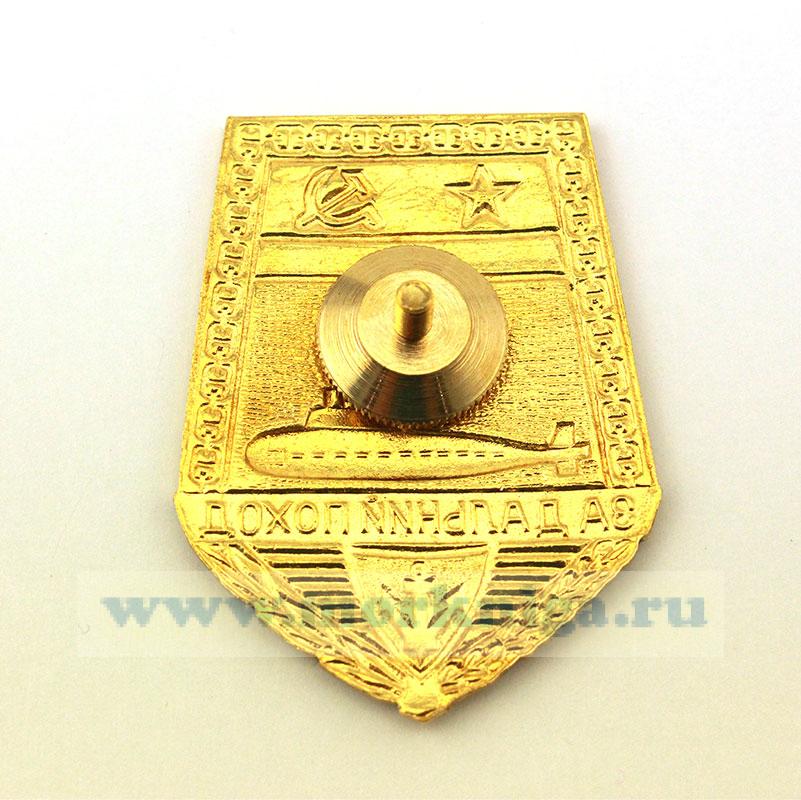 Пятиугольный щит, окаймленный наверху и по бокам золотистой полосой с изображением якорной цепи, низ обрамлен золотистыми дубовыми, справа, и лавровыми, слева, листьями. Внутреннюю верхнюю часть щита занимает военно-морской флаг СССР образца 27 мая 1935 т. На средней темно-синей части под флагом находится стилизованное изображение земного шара в виде золотистой сетки меридианов и параллелей с наложенными на него главными румбами компаса красного цвета. Под ним размещен силуэт всплывающей атомной многоцелевой торпедной подводной лодки. Еще ниже находится поперечная полоса золотистого цвета с черной надписью: "За дальний поход".