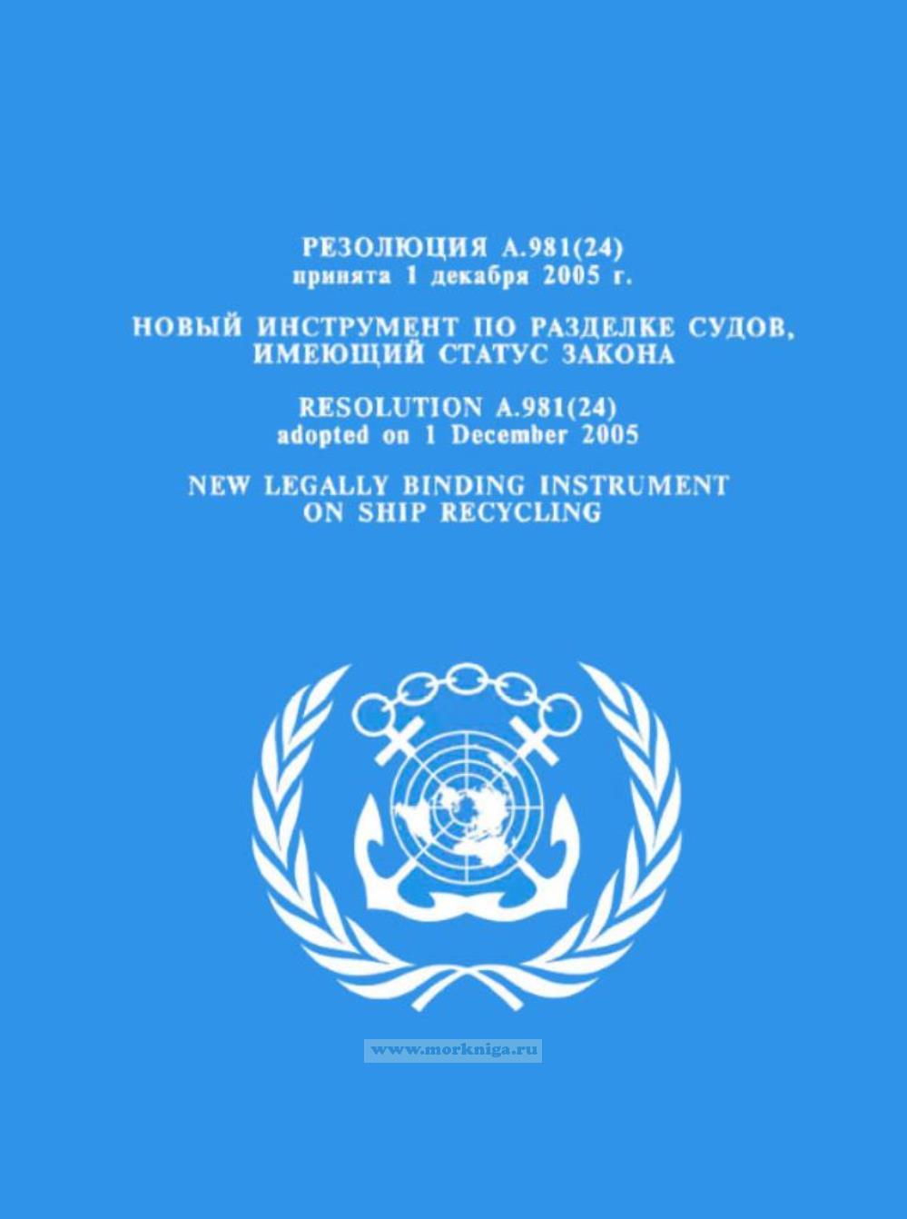 Резолюция A.981(24) "Новый инструмент по разделке судов, имеющий статус закона" включена в Сборник № 30 резолюций ИМО. Collection No.30 of IMO Resolutions