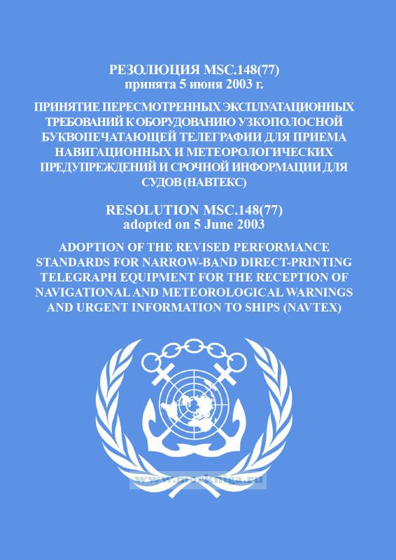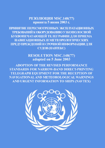 Резолюция MSC.148(77) "Принятие пересмотренных эксплуатационных требований к оборудованию узкополосной буквопечатающей телеграфии для приема навигационных и метеорологических предупреждений и срочной информации для судов (НАВТЕКС) " включена в Сборник № 22 резолюций ИМО. Collection No.22 of IMO Resolutions