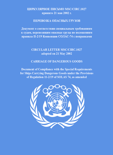 Циркулярное письмо MSC/Circ.1027 "Перевозка опасных грузов. Документ о соответствии специальным требованиям к судам, перевозящим опасные грузы по положениям правила II-2/19 Конвенции СОЛАС-74 с поправками" включено в Сборник № 19 резолюций ИМО. Collection No.19 of IMO Resolutions