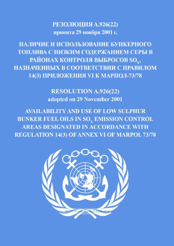 Резолюция A.926(22) Наличие и использование бункерного топлива с низким содержанием серы в районах контроля выбросов SOX, назначенных в соответствии с правилом 14(3) приложения VI к МАРПОЛ-73/78 включена в Сборник № 18 резолюций ИМО. Collection No.18 of IMO Resolutions