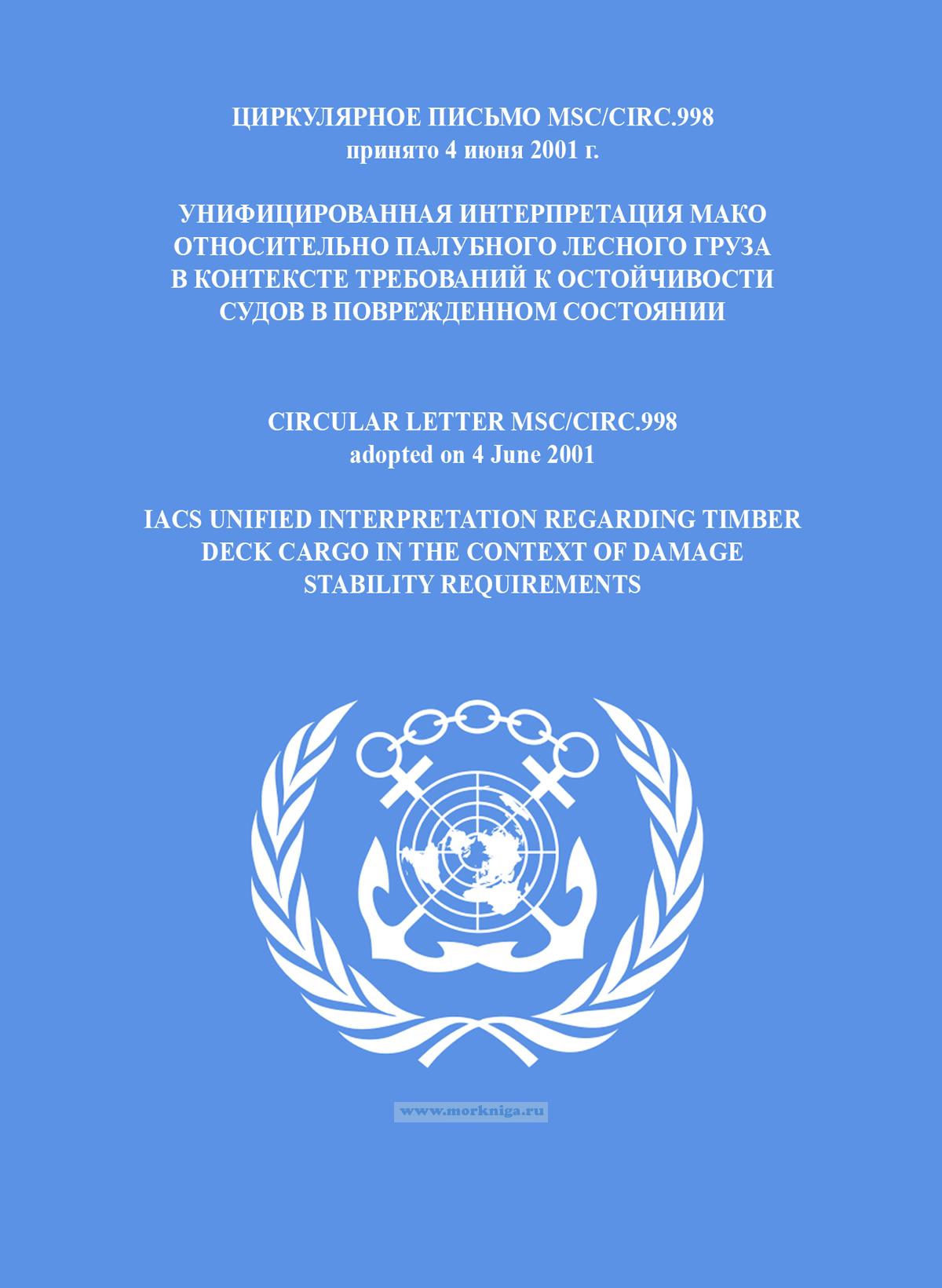 Циркулярное письмо MSC/Circ.998 "Унифицированная интерпретация МАКО относительно палубного лесного груза в контексте требований к остойчивости судов в поврежденном состоянии" включено в Сборник № 17 резолюций ИМО. Collection No.17 of IMO Resolutions