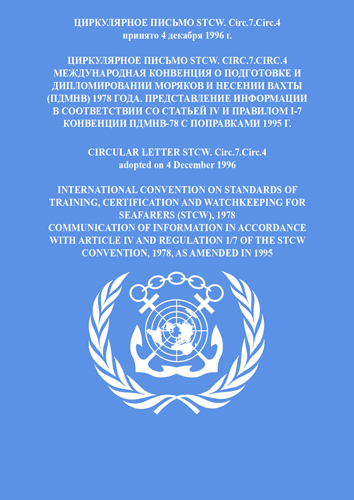 Циркулярное письмо STCW. Circ.7.Circ.4. "Международная Конвенция о подготовке и дипломировании моряков и несении вахты (ПДМНВ) 1978 года. Представление информации в соответствии со статьей IV и правилом I-7 Конвенции ПДМНВ-78 с поправками 1995 г." включено в Сборник № 7 резолюций ИМО. Collection No.7 of IMO Resolutions