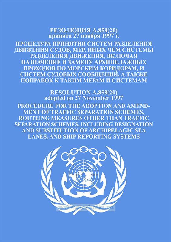 Резолюция А.858(20) "Процедура принятия систем разделения движения судов, мер, иных чем системы разделения движения, включая назначение и замену архипелажных проходов по морским коридорам, и систем судовых сообщений, а также поправок к таким мерам и системам" включена в Сборник № 8 резолюций ИМО. Collection No.8 of IMO Resolutions (2-е изд.)