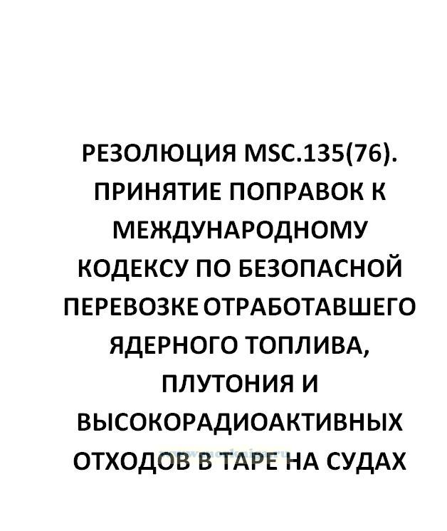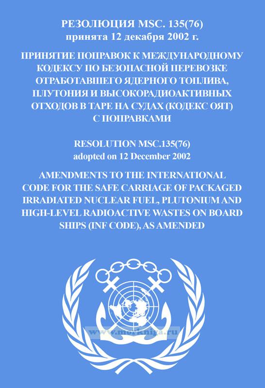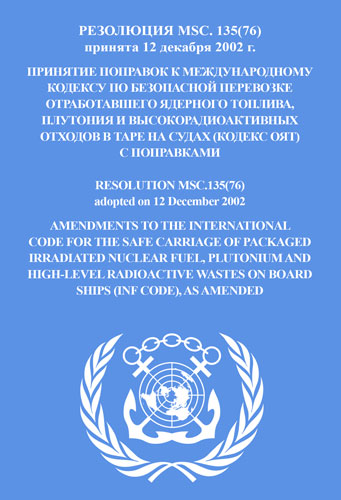 Резолюция MSC.135(76). Принятие поправок к Международному кодексу по безопасной перевозке отработавшего ядерного топлива, плутония и высокорадиоактивных отходов в таре на судах (кодекс ОЯТ) с поправками включена в Сборник № 13 резолюций ИМО. Collection No.13 of IMO Resolutions