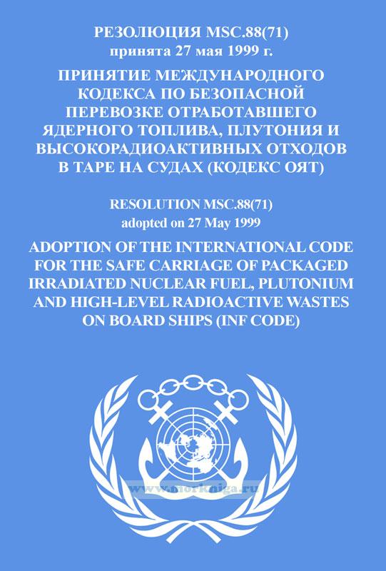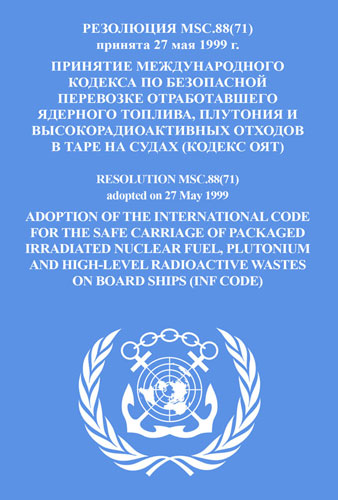 Резолюция MSC.88(71) Принятие Международного Кодекса по безопасной перевозке отработавшего ядерного топлива, плутония и высокорадиоактивных отходов в таре на судах (кодекс ОЯТ) включена в Сборник № 13 резолюций ИМО. Collection No.13 of IMO Resolutions