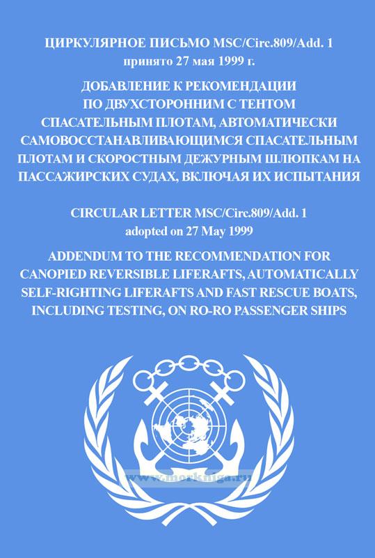 Циркулярное письмо MSC.Circ.809. Add.1. "Добавление е рекомендации по двухсторонним с тентом спасательным плотам, автоматически самовосстанавливающимся спасательным плотам и скоростным дежурным шлюпкам на пассажирских судах, включая их испытания" включено в Сборник № 14 резолюций ИМО. Collection No.14 of IMO Resolutions