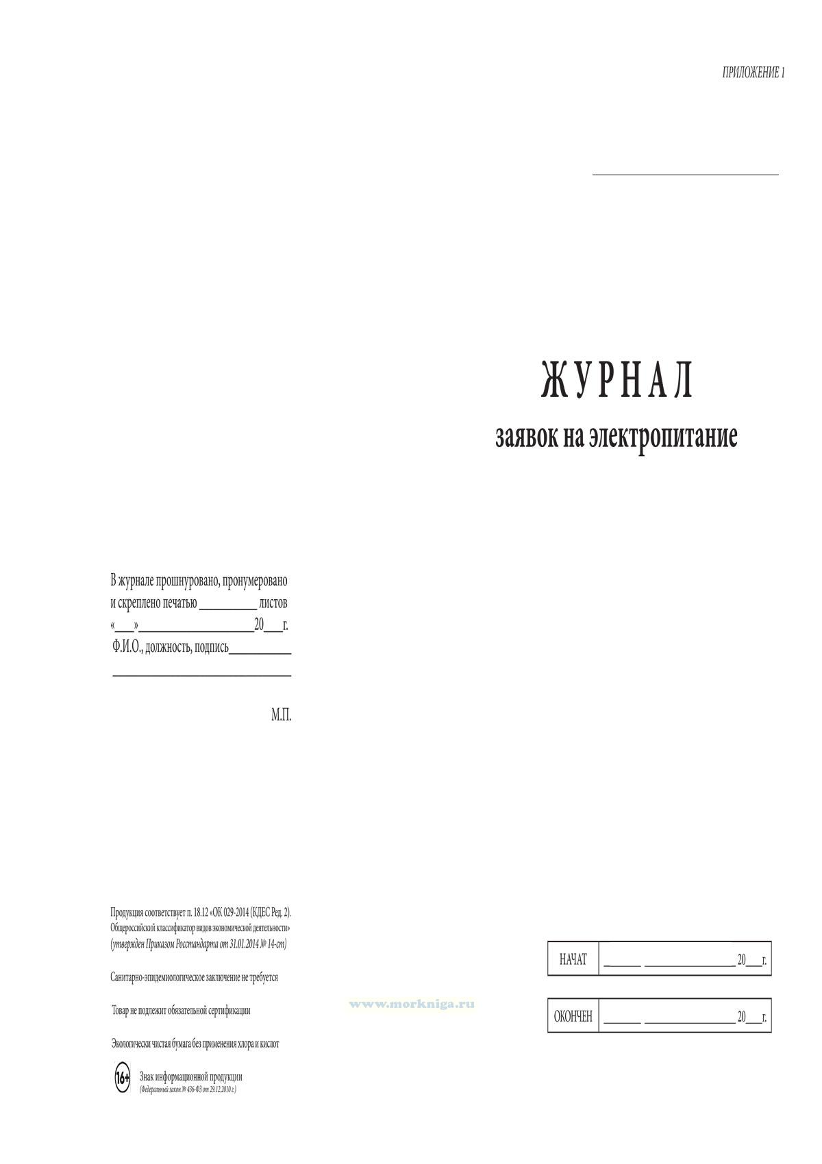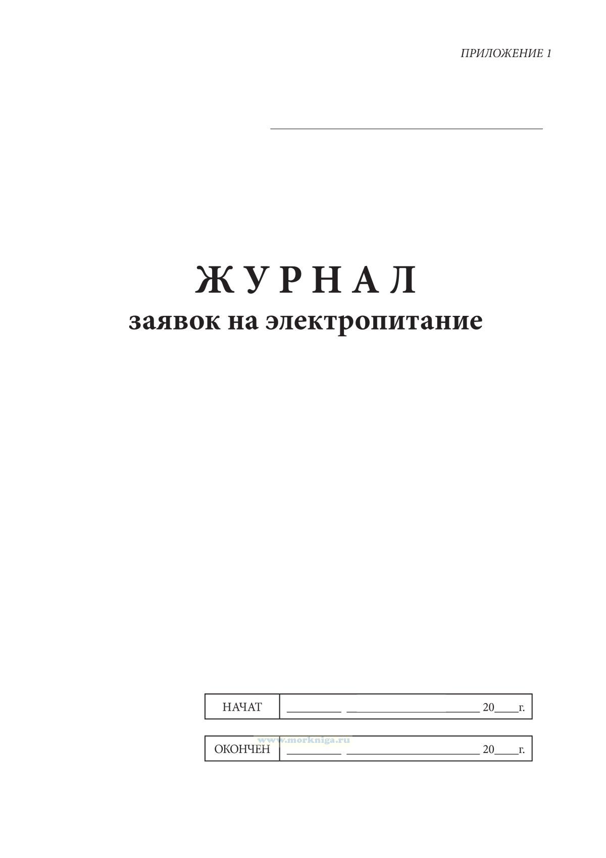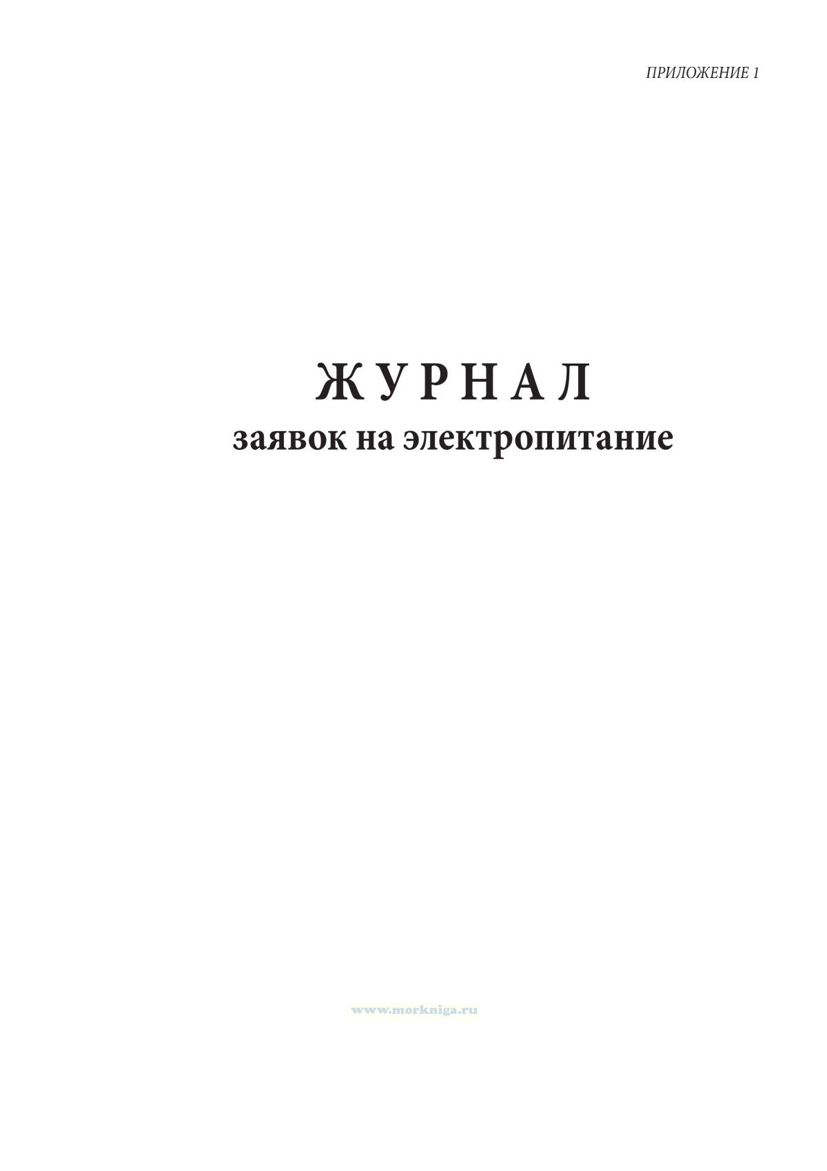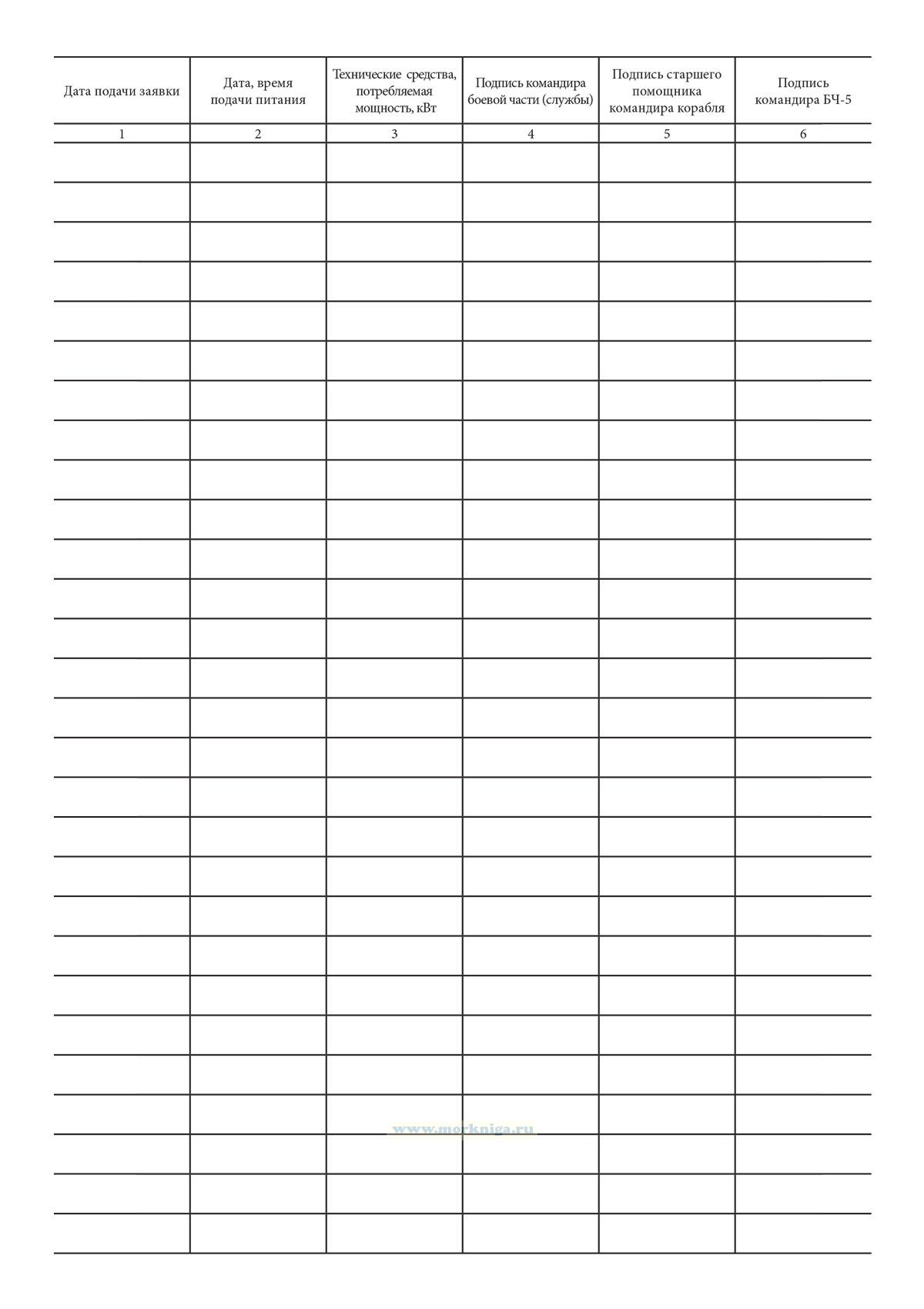 Форма журнала заявок на электропитание соответствует Приложению 1 к Правилам эксплуатации электрооборудования кораблей ВМФ. ПЭЭК-91.