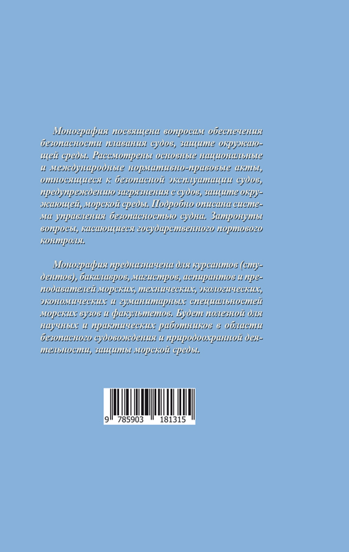 Монография посвящена вопросам обеспечения безопасности плавания судов, защиты окружающей среды. Рассмотрены основные национальные и международные нормативно-правовые акты, относящиеся к безопасной эксплуатации судов, предупреждению загрязнения с судов, защите окружающей, морской среды. Подробно описана система управления безопасностью судна. Затронуты вопросы, касающиеся государственного портового контроля.