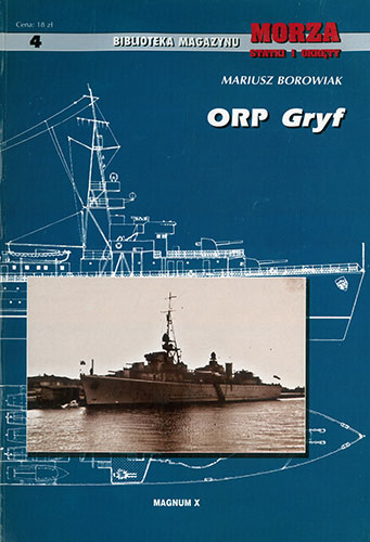 Fotografia па IV stronie okladki: Bodaj najpiekniejsze zdjecie Gryfa. Zdaniem niektorych jest to moment uroczystego powitania stawiacza min w Gdyni w dniu 6 marca 1938 r. Pod lodziami widoczna beczka z latwopalnym paliwem do silnikow hdziowych, ktorq w przypadku koniecznosci mozna byh fatwo wyrzucic za burte. W plaszczyznie symetrii pomostu widoczny gfosnik okretowy. Na skrzydlach mate reflektory szperacze, sluzqce takze do celow sygnalizacyjnych.