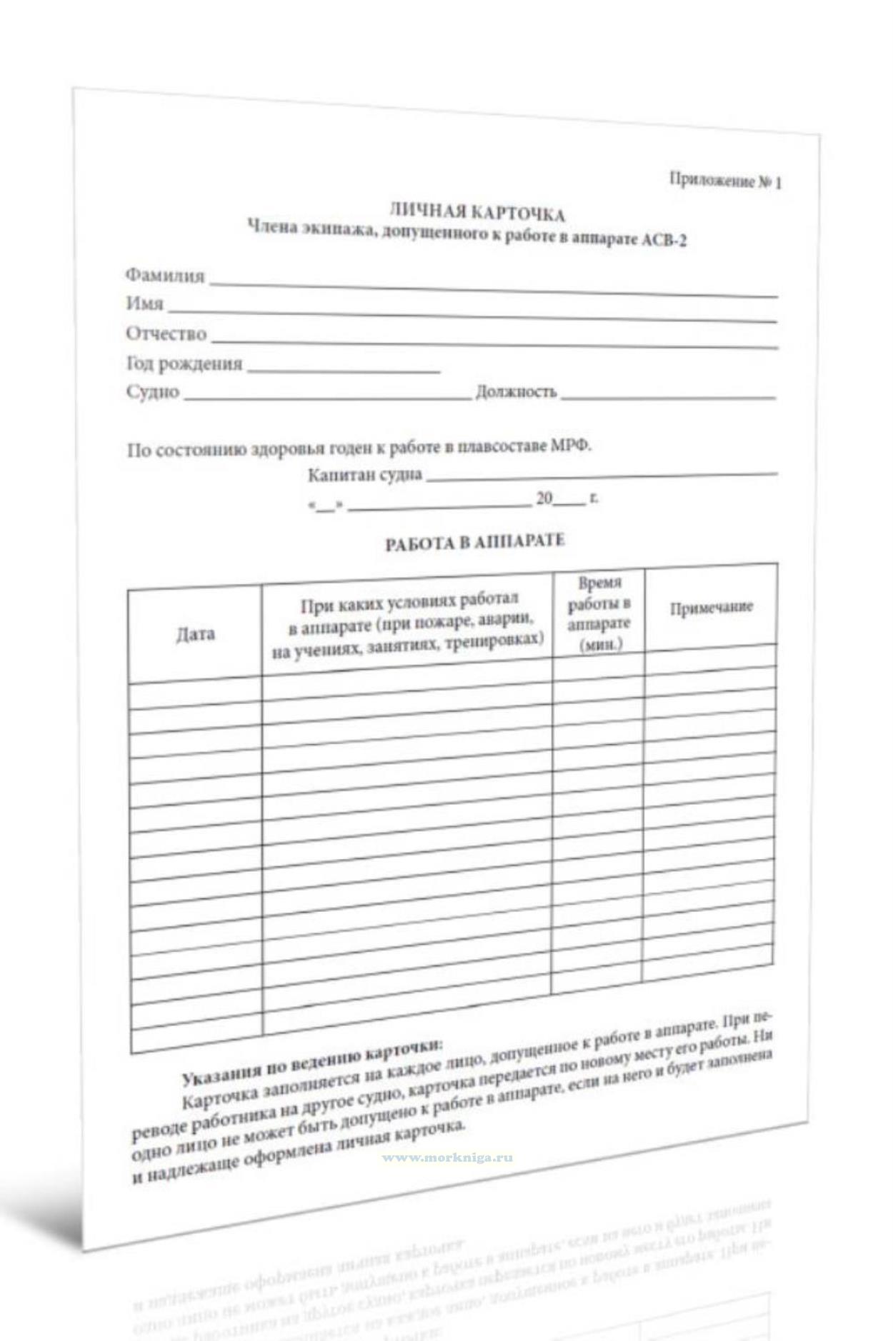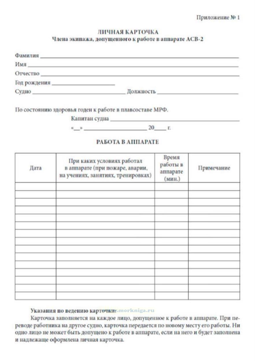 Форма Личной карточки члена экипажа, допущенного к работе в аппарате АСВ-2 соответствует Приложению 1 к Инструкции по использованию на судах Министерства речного транспорта РСФСР индивидуальных дыхательных аппаратов типа АСВ-2 на сжатом воздухе.
