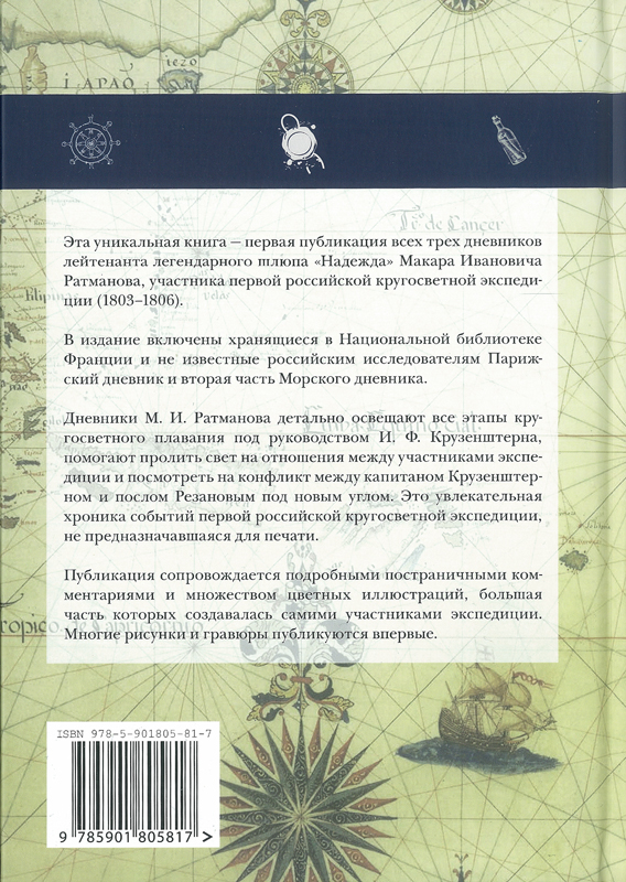 В книге впервые в полном объёме представлены дневники первого лейтенанта "Надежды" Макара Ивановича Ратманова (включены хранящиеся в Национальной библиотеке Франции и не известные российским исследователям Парижский дневник и вторая часть Морского). Публикация сопровождается подробными постраничными комментариями.