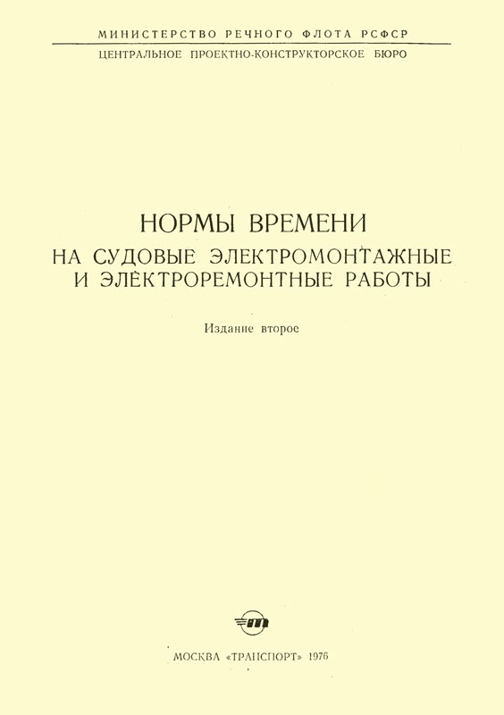 Сборник «Нормы времени на судовые электромонтажные и электроремонтные работы» (изд. 2-е, арх. № 3477) является откорректированным изданием сборника «Нормы времени на судовые электромонтажные и электроремонтные работы» (изд. 1-е, арх. № 2274-А), утвержденного руководством Министерства речного флота РСФСР 28 декабря 1963 г. и согласованного с ЦК профсоюза рабочих морского и речного флота 7 декабря 1963 г. (протокол № 6).