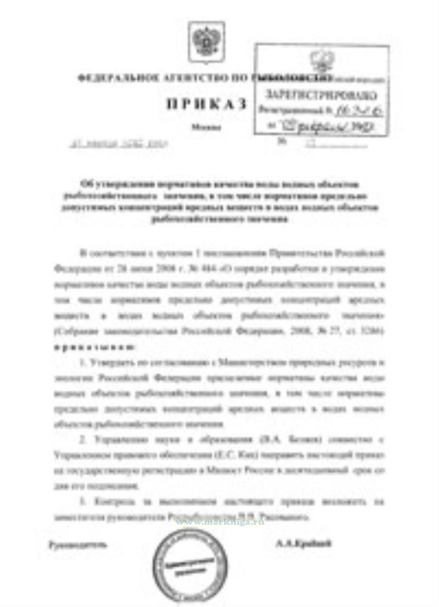 Приказ Федерального агентства по рыболовству от 18 января 2010 г. № 20 «Об утверждении нормативов качества воды водных объектов рыбохозяйственного значения, в том числе нормативов предельно допустимых концентраций вредных веществ в водах водных объектов рыбохозяйственного значения»