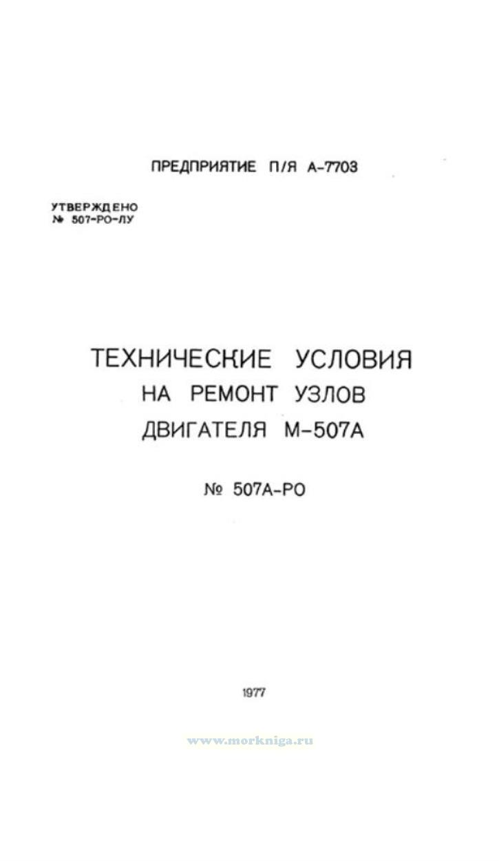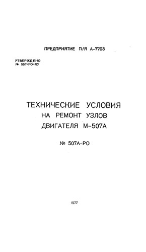 Технические условия на ремонт узлов двигателей М-507А являются обязательным руководящим документом для всех предприятий, производящих ремонт двигателей, а также представителей заказчика на местах ремонтируемого объекта, производящих приемку отремонтированных двигателей.