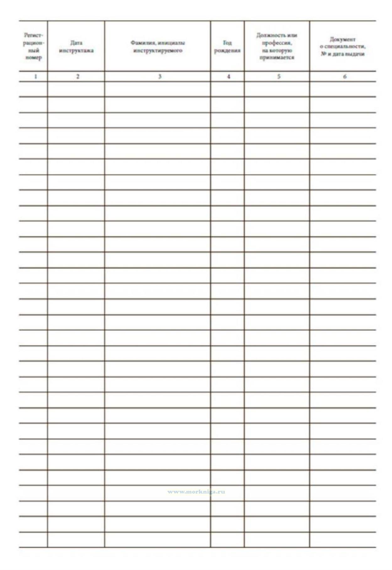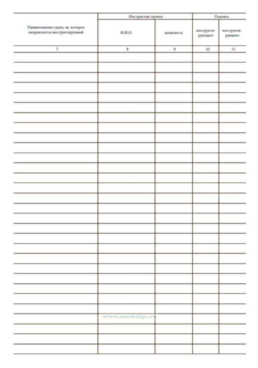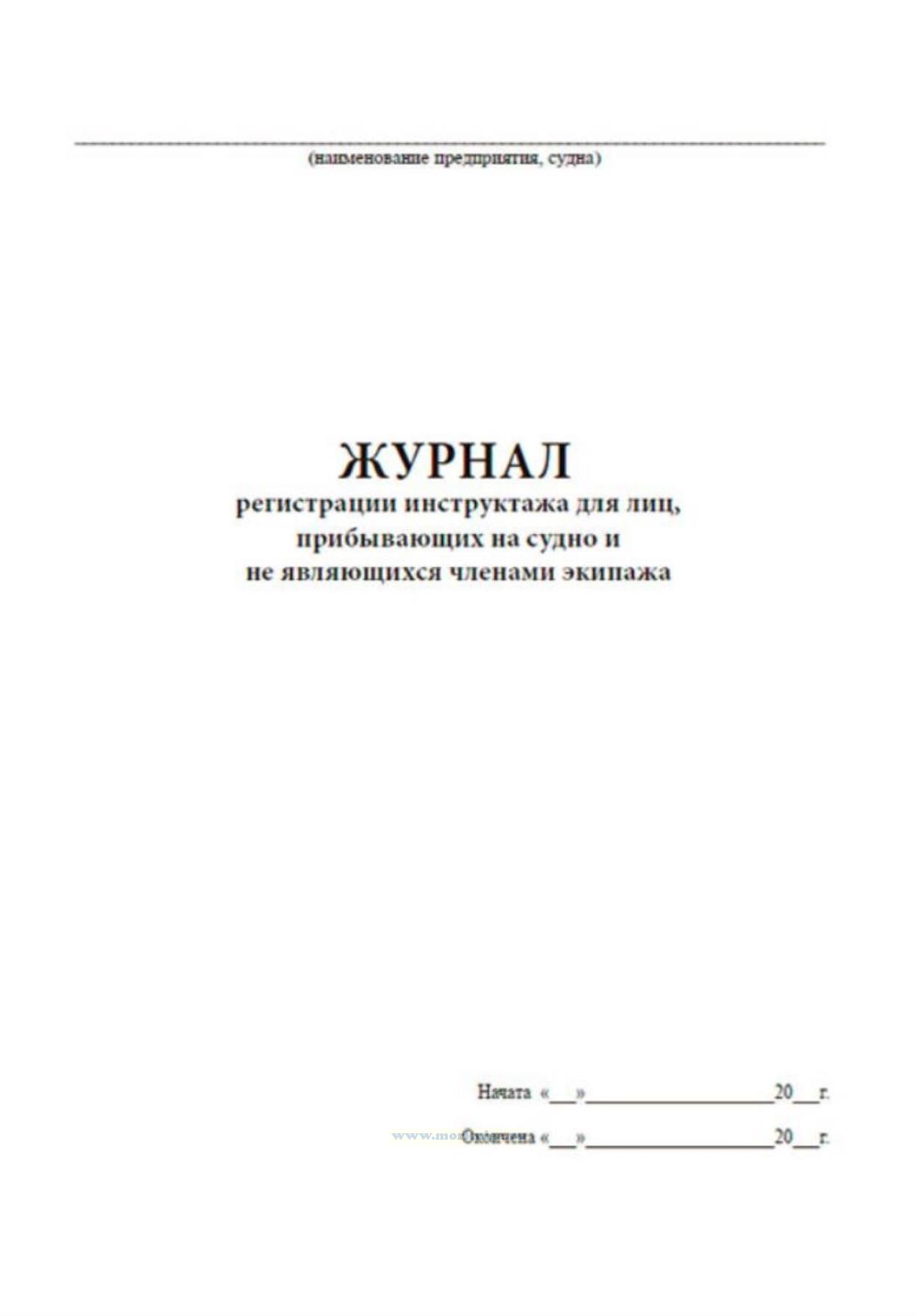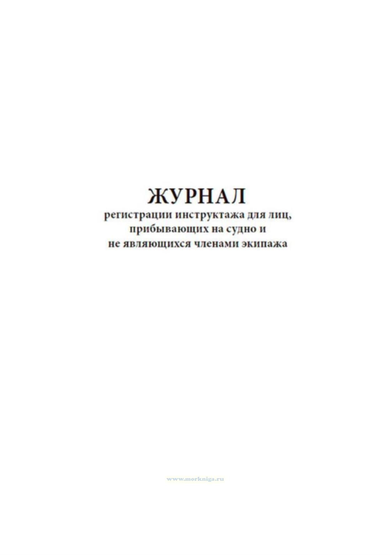 Учет проведения инструктажа для лиц, прибывающих на судно и не являющихся членами экипажа, регистрируют в журнале. Журнал регистрации инструктажа для лиц, прибывающих на судно и не являющихся членами экипажа имеет графы: 1 Регистрационный номер 2 Дата инструктажа 3 Фамилия, инициалы инструктируемого 4 Год рождения 5 Должность или профессия, на которую принимается 6 Документ о специальности, № и дата выдачи 7 Наименование судна, на которое направляется инструктируемый 8-9 Инструктаж провел -Ф.И.О. -должность 10-11 Подпись -инструктирующего -инструктируемого