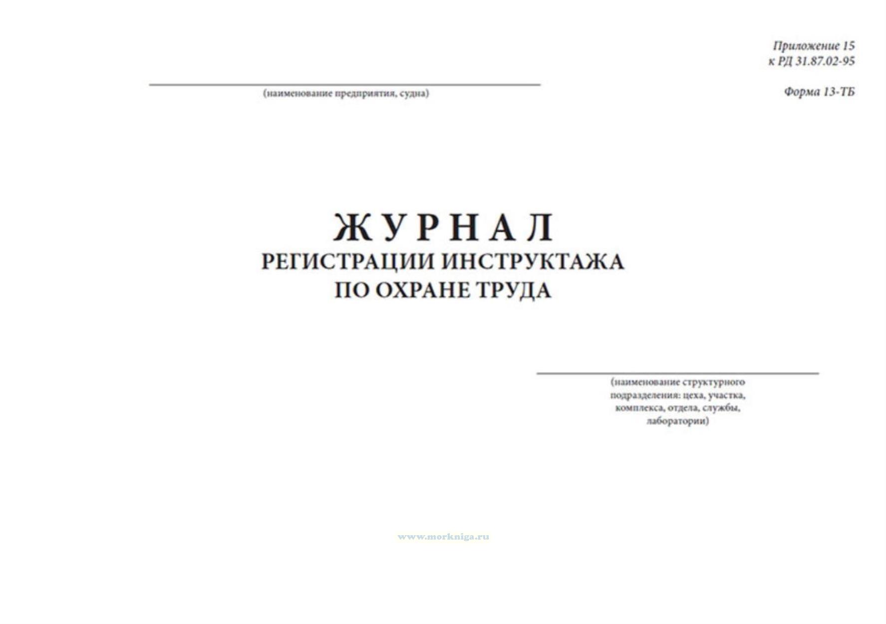 Форма журнала регистрации инструктажа по охране труда (13-ТБ) соответствует Приложению 15 к РД 31.87.02-95. Положение об обучении и инструктаже по охране труда работников плавающего состава судов морского транспорта и Приложению 7 к РД 31.87.03-95. Положение об обучении и инструктаже по охране труда работников предприятий, организаций и учреждений морского транспорта.