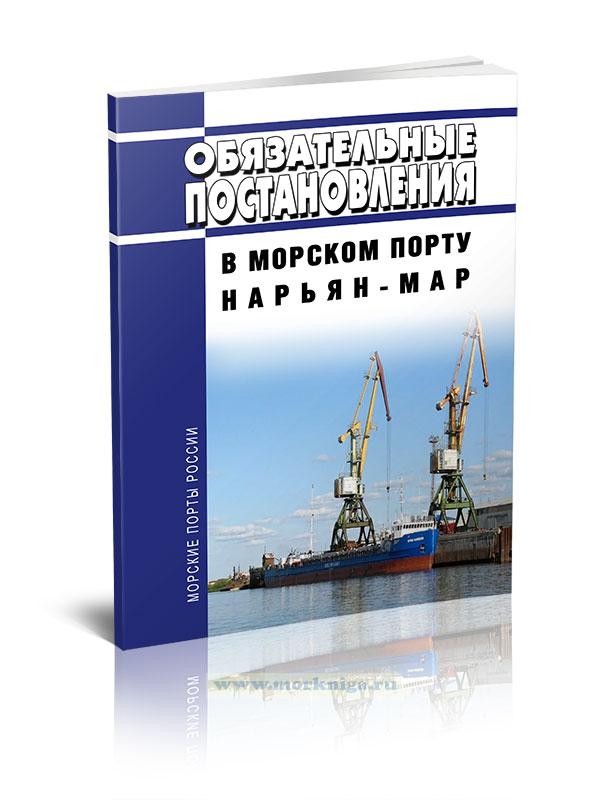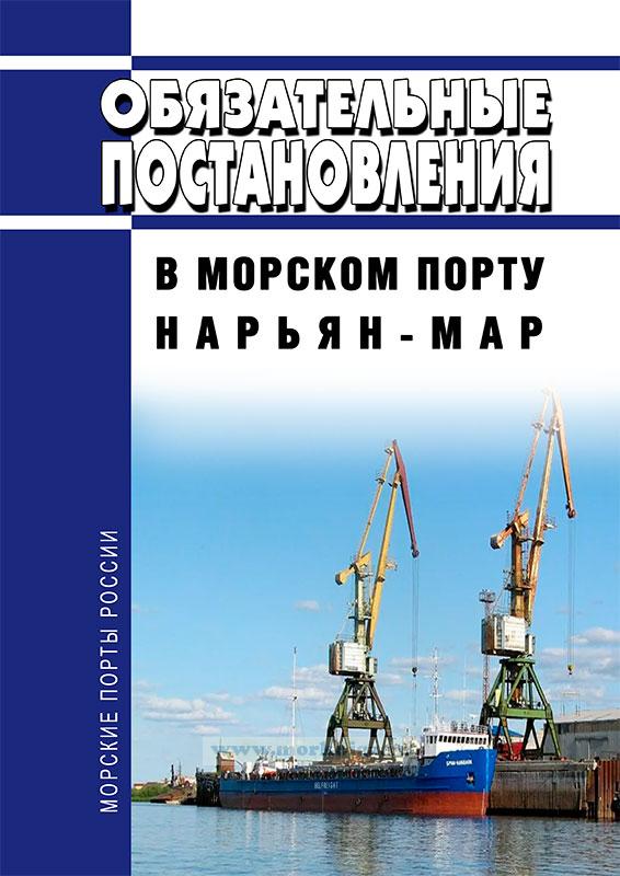Обязательные постановления в морском порту Нарьян-Мар разработаны в соответствии с Федеральным законом от 8 ноября 2007 г. N 261-ФЗ О морских портах в Российской Федерации и о внесении изменений в отдельные законодательные акты Российской Федерации, Федеральным законом от 30 апреля 1999 г. N 81-ФЗ Кодекс торгового мореплавания Российской Федерации, Общими правилами плавания и стоянки судов в морских портах Российской Федерации и на подходах к ним). Настоящие Обязательные постановления содержат описание морского порта Нарьян-Мар; правила захода судов в морской порт и выхода судов из морского порта; правила плавания судов в акватории морского порта; описание зоны действия системы управления движением судов и правила плавания судов в этой зоне; правила стоянки судов в морском порту и указания мест их стоянки; правила обеспечения экологической безопасности, соблюдения карантина в морском порту; правила пользования специальными средствами связи на территории и акватории морского порта; сведения о границах морского порта; сведения о границах морского района A1 Глобальной морской системы связи при бедствии и для обеспечения безопасности; сведения о технических возможностях морского порта в части приема судов; сведения о периоде навигации; сведения о районе обязательной лоцманской проводки судов; сведения о глубинах акватории морского порта; сведения о переработке опасных грузов; сведения о передаче информации капитанами судов, находящихся в морском порту, при возникновении угрозы актов незаконного вмешательства в морском порту; сведения о передаче навигационной и гидрометеорологической информации капитанам судов, находящихся в морском порту; иную предусмотренную нормативными правовыми актами Российской Федерации в области торгового мореплавания информацию.