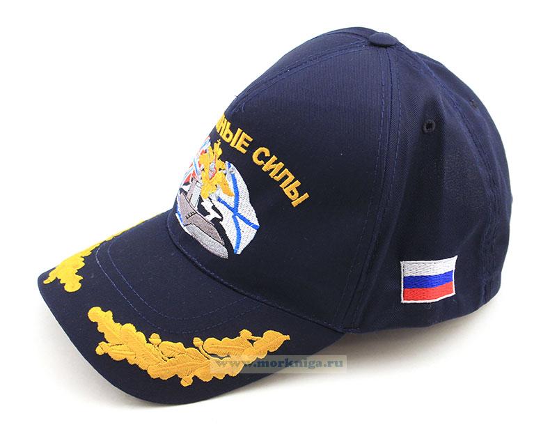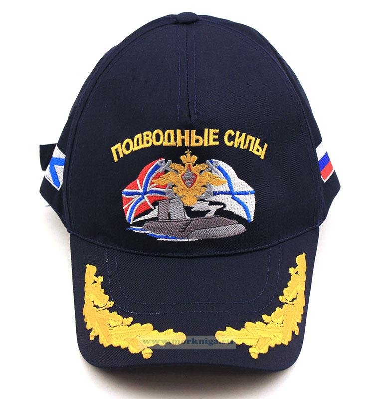 На бейсболке вышита надпись: "Подводные силы", на фоне герба России два перекрещенных адмиралтейских якоря, Андреевский флаг и флаг гюйс, дубы на козырьке, по бокам флаги.