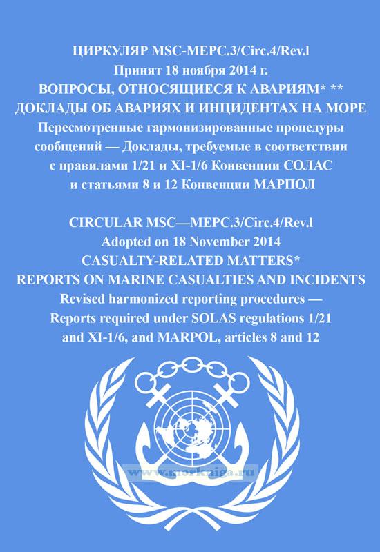 В книге приведен параллельный англо-русский текст Циркуляра MSC—МЕРС.3.Circ.4.Rev. 1. Вопросы, относящиеся к авариям. Доклады об авариях и инцидентах на море Пересмотренные гармонизированные процедуры сообщений — Доклады, требуемые в соответствии с правилами 1/21 и XI-1 /6 Конвенции СОЛАС и статьями 8 и 12 Конвенции МАРПОЛ включен в Сборник № 48 резолюций ИМО. Collection No.48 of IMO Resolutions