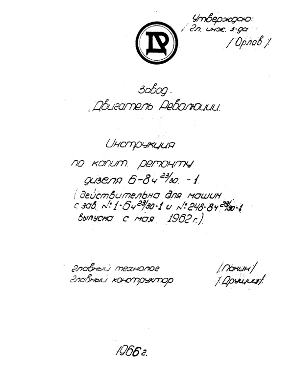Настоящая инструкция обязательна для всех организаций, выполняющих капитальный ремонт дизелей типа 6 -8 ч23/30. В целях проведения качественного ремонта и обеспечения надежной работы дизеля, технический персонал, допущенный к проведению капитального ремонта, должен быть хорошо ознакомлен с данной инструкцией, иметь соответствующую квалификацию, уметь выполнять все необходимые слесарные работы, знать устройство и назначение всех узлов и деталей дизеля, особенности и условия их работы, знать и соблюдать правила по технике безопасности.