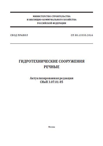 СП 80.13330.2016 "Гидротехнические сооружения речные. Актуализированная редакция СНиП 3.07.01-85" утв. Приказом Министерства строительства и жилищно-коммунального хозяйства Российской Федерации от 3 декабря 2016 г. N 889/пр и введен в действие с 4 июня 2017 г.