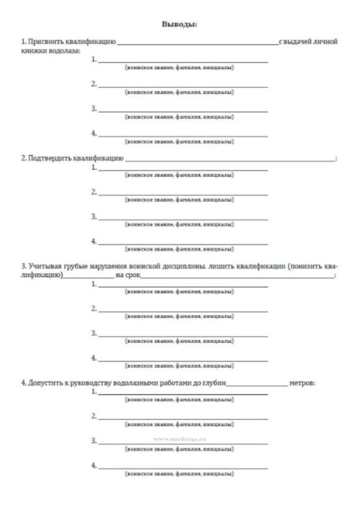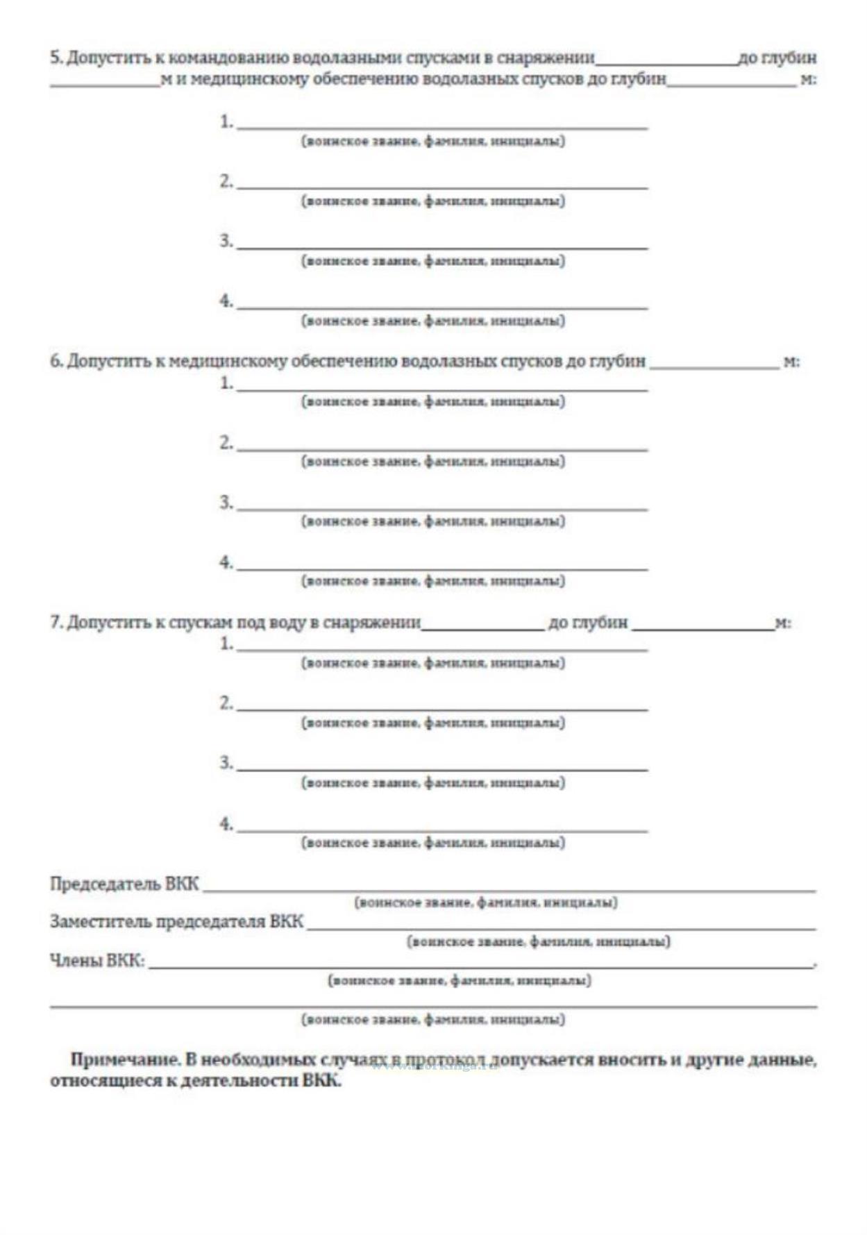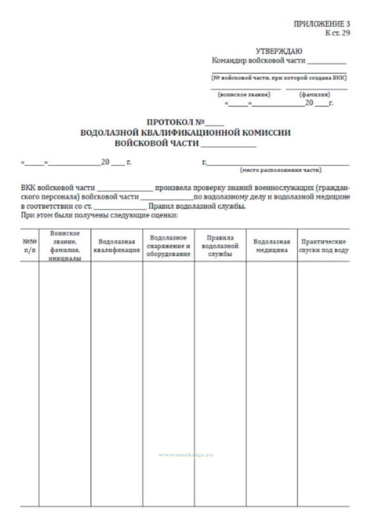 Форма Протокола водолазной квалификационной комиссии войсковой части соответствует Приложению 3 к Правилам водолазной службы военно-морского флота 2002. Часть 1. Организация водолазного дела в ВМФ. Спуски на малые и средние глубины.