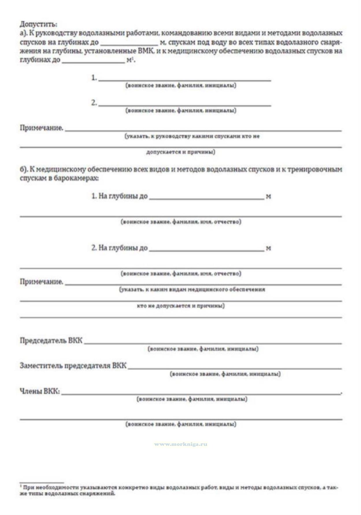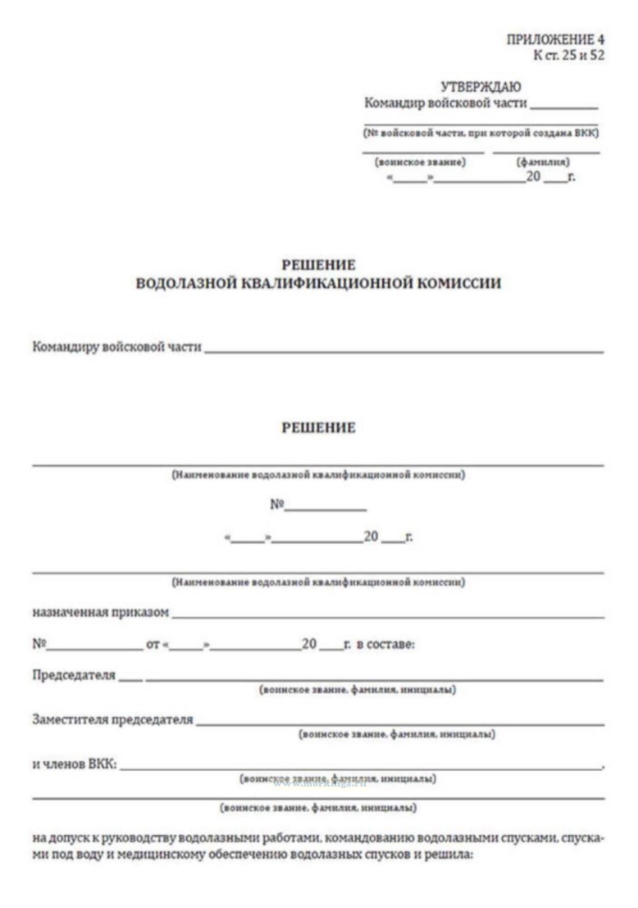 Форма бланка Решения водолазной квалификационной комиссии соответствует Приложению 4 к ПВС ВМФ Правилам водолазной службы военно-морского флота 2002. Часть 1. Организация водолазного дела в ВМФ. Спуски на малые и средние глубины.